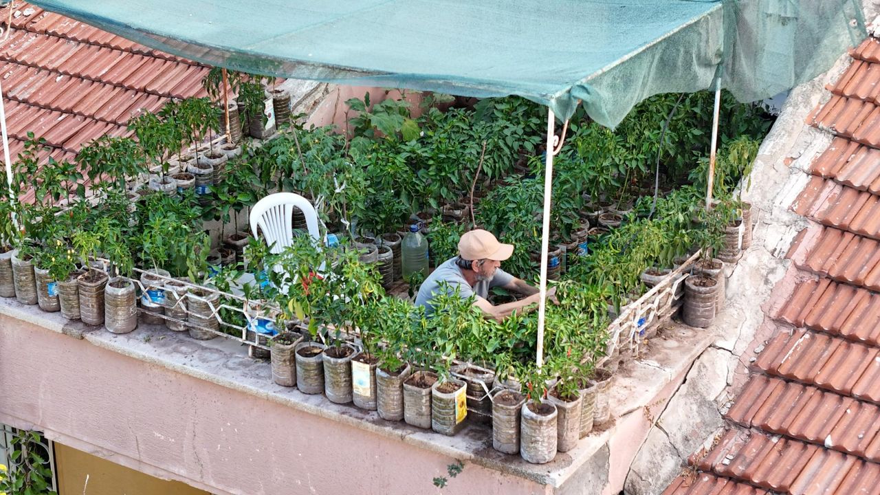 Eskişehir'in Odunpazarı ilçesinde, Vişnelik Mahallesi'nin görmeye alışık olmadığımız manzaralarından biri, bir baskı dükkanının çatısında yemyeşil bir vaha gibi yükseliyor. 63 yaşındaki Salim Pektaş, iş yerinin 18 metrekarelik terasını, içi toprak dolu 200 plastik bidonla adeta bir sebze cennetine dönüştürmüş durumda.