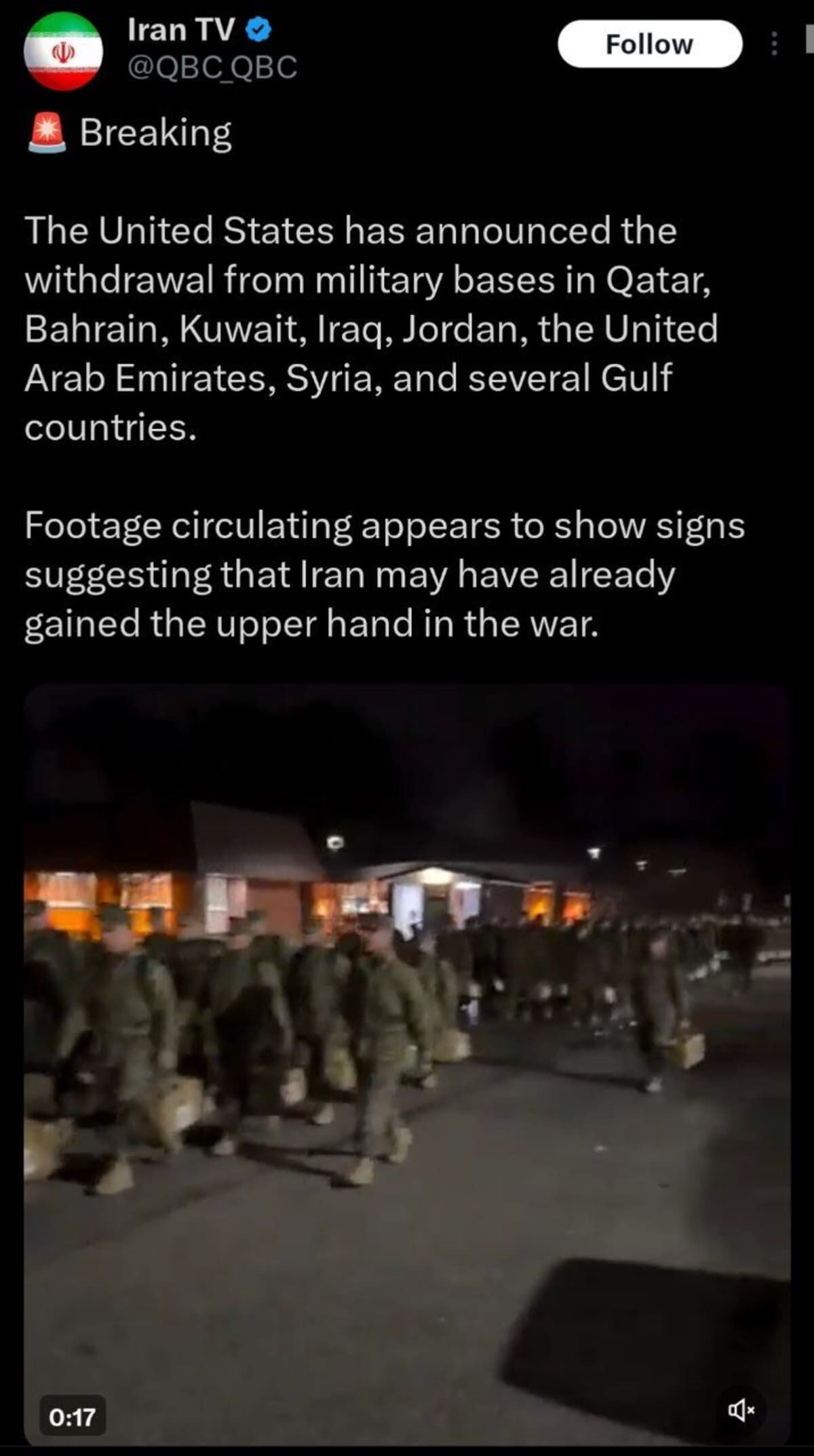 İlgili paylaşımı yapan hesabın kullanıcı adı @QBC_QBC resmi bir devlet kanalıyla eşleşmiyor ve iddia edilen kapsamda bir geri çekilme haberi dünya basınında da yer almadı. İlgili paylaşımda yazılı olanlar ise şöyle: "Amerika Birleşik Devletleri; Katar, Bahreyn, Kuveyt, Irak, Ürdün, Birleşik Arap Emirlikleri, Suriye ve birkaç Körfez ülkesindeki askeri üslerden çekileceğini duyurdu. Dolaşımda olan görüntüler, İran'ın savaşta şimdiden üstünlük sağlamış olabileceğine dair işaretler sunuyor gibi görünüyor."