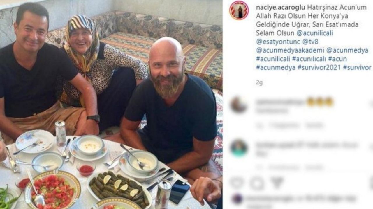 Naciye Acaroğlu, Ilıcalı ve Yontunç'un yer sofrasında çekilen fotoğrafını Instagram'da paylaştı. "Hatırşinas Acun’um Allah razı olsun her Konya’ya geldiğinde uğrar, Sarı Esat'ıma da selam olsun "