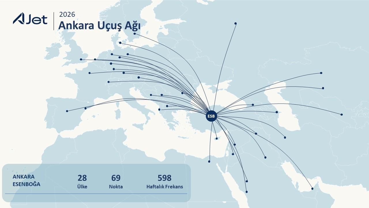 Başkent Ankara'dan yurt dışına en fazla sefer yapan havayolu şirketi konumunda bulunan AJet, bu kez yurt dışı ağını Romanya'nın başkenti Bükreş ile genişletti. 2 Nisan tarihinde başlayacak seferlerin haftada 3 gün karşılıklı uçuşlarla devam edeceği kaydedildi.