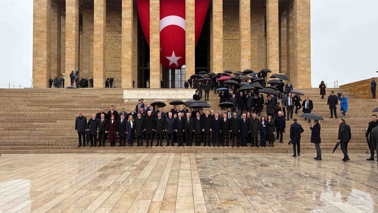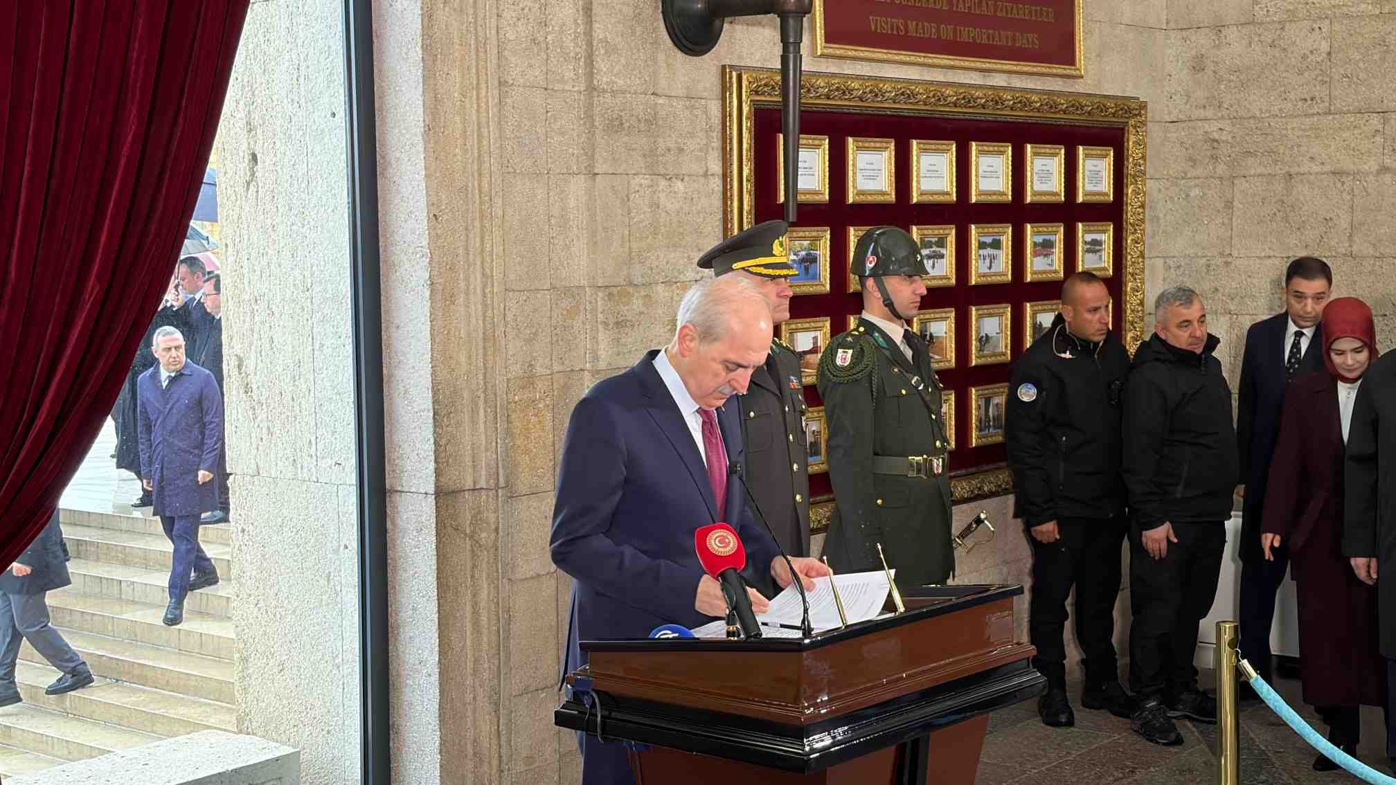Törene TBMM Başkanı Numan Kurtulmuş'un yanı sıra Cumhurbaşkanı Yardımcısı Cevdet Yılmaz, CHP Genel Başkanı Özgür Özel, Aile ve Sosyal Hizmetler Bakanı Mahinur Özdemir Göktaş, Milli Eğitim Bakanı Yusuf Tekin, Sağlık Bakanı Kemal Memişoğlu, İYİ Parti Genel Başkanı Müsavat Dervişoğlu ve MHP'yi temsilen TBMM Başkan Vekili Celal Adan katıldı. Heyet, Aslanlı Yol'dan yürüyerek Atatürk'ün mozolesine geldi. TBMM Başkanı Kurtulmuş'un mozoleye çelenk bırakmasının ardından saygı duruşunda bulunuldu ve İstiklal Marşı okundu. Kurtulmuş, daha sonra Misak-ı Milli Kulesi'nde Anıtkabir Özel Defteri'ni imzalayarak şunları yazdı: