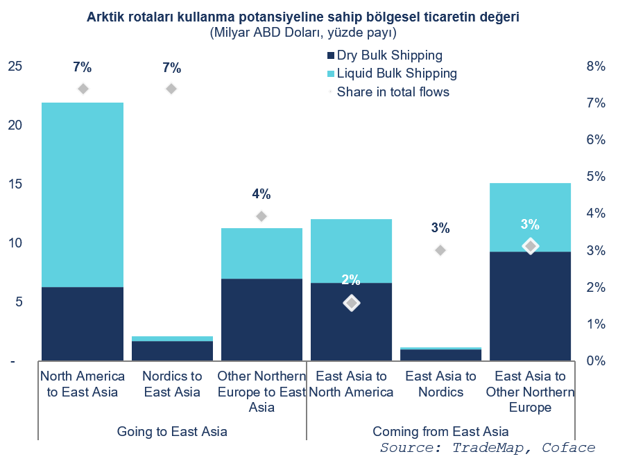 Toplamda, Doğu Asya, Kuzey Avrupa ve Kuzey Amerika arasındaki ticaretin yaklaşık yüzde 3,5’inin Arktik rotalarını kullanması bekleniyor. Bu nedenle, kısa vadede bu rotaların küresel ticaret haritası üzerindeki etkisinin sınırlı kalacağı öngörülüyor.