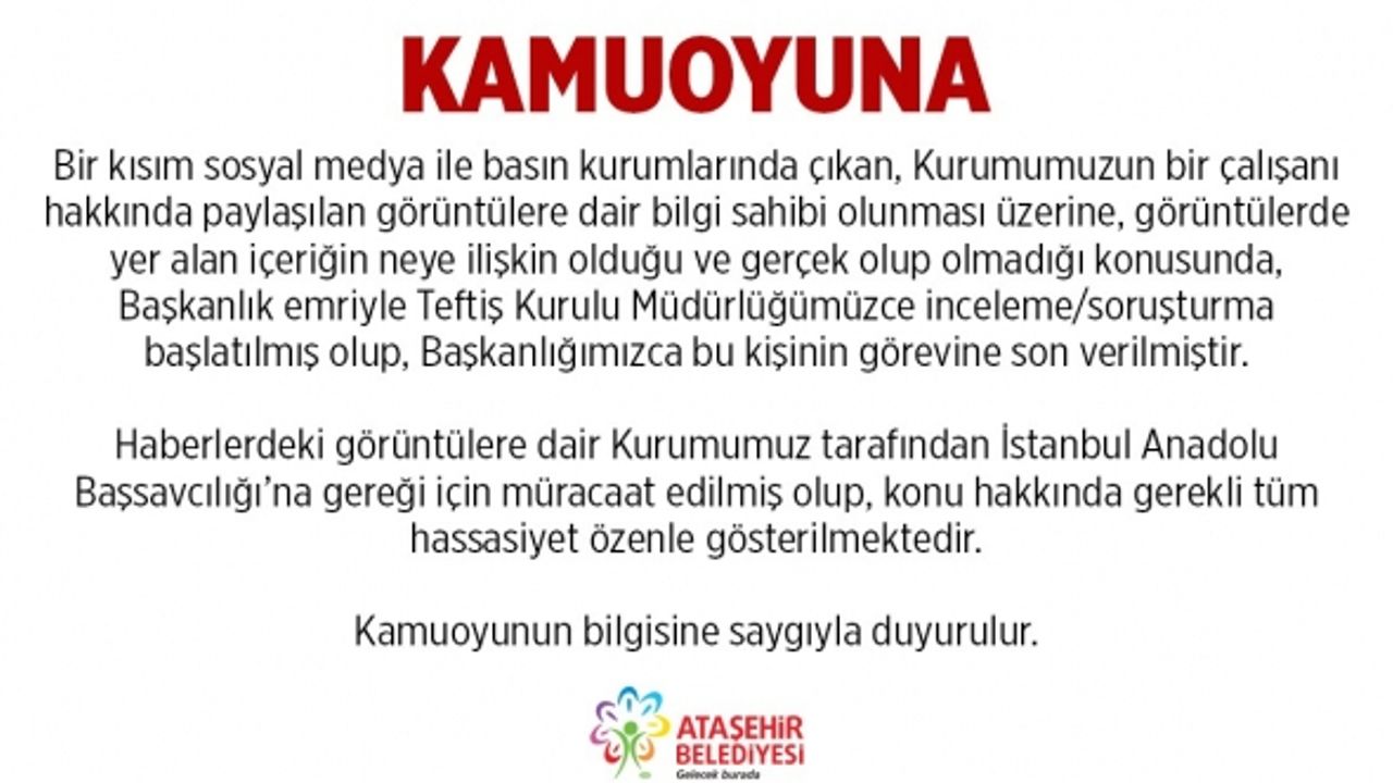 Ataşehir Belediyesi tarafından yapılan açıklamada, “Bir kısım sosyal medya ile basın kurumlarında çıkan, Kurumumuzun bir çalışanı hakkında paylaşılan görüntülere dair bilgi sahibi olunması üzerine, görüntülerde yer alan içeriğin neye ilişkin olduğu ve gerçek olup olmadığı konusunda, Başkanlık emriyle Teftiş Kurulu Müdürlüğümüzce inceleme/soruşturma başlatılmış olup, Başkanlığımızca bu kişinin görevine son verilmiştir.