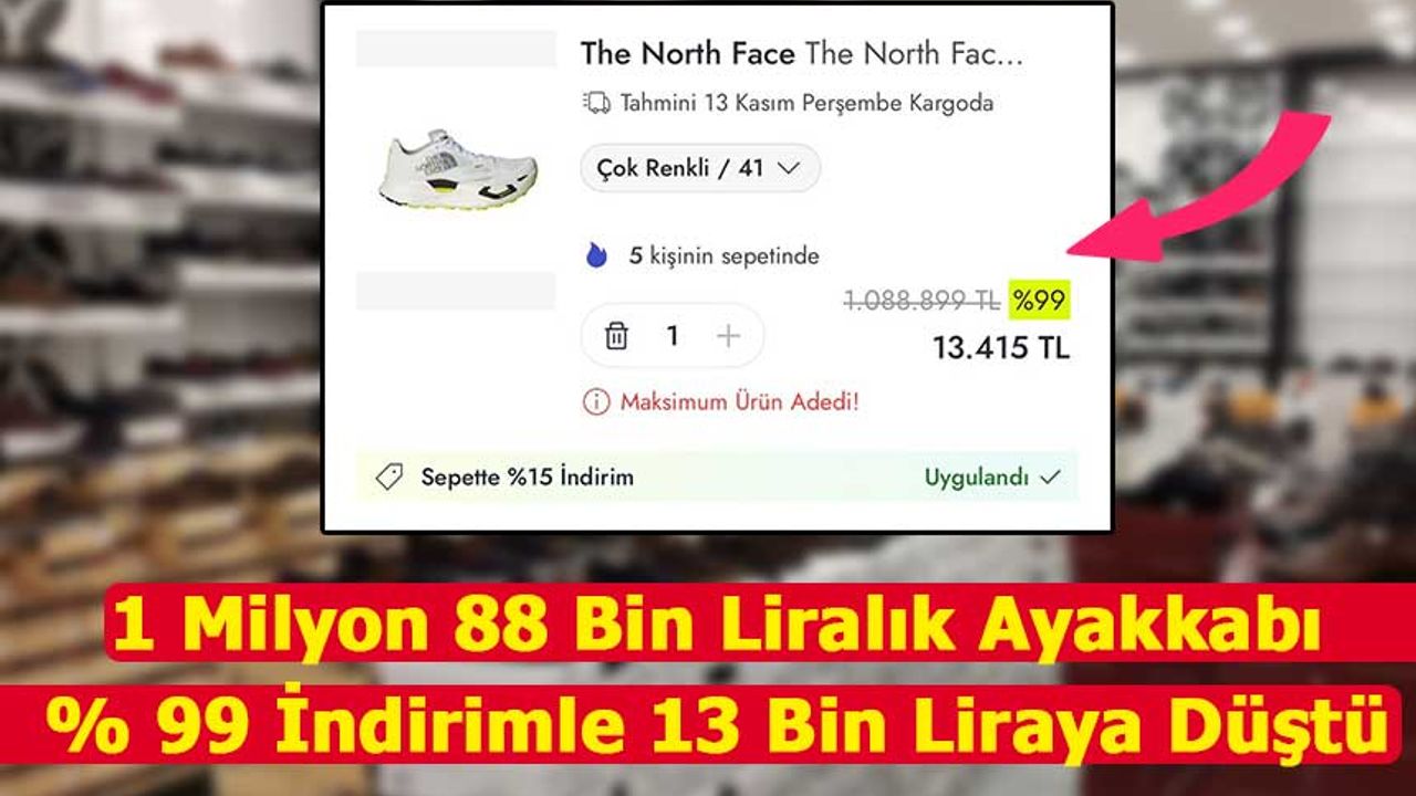 Bursa’da bir online alışveriş sitesinde, ayakkabının fiyatı önce 1 milyon 88 bin lira olarak gösterildi, ardından yüzde 99 indirim uygulanmış gibi 13 bin 415 liraya düşürüldü. Görünen o ki, kampanya dozu bu kez oldukça kaçmış durumda.