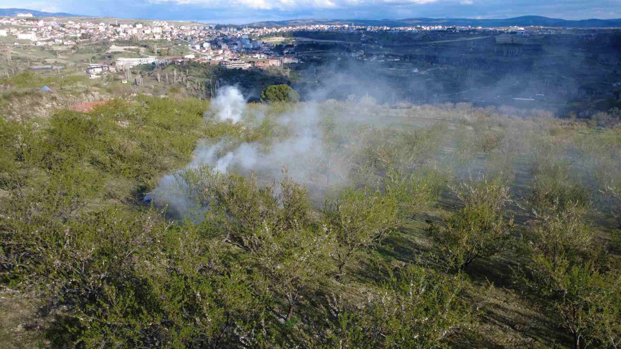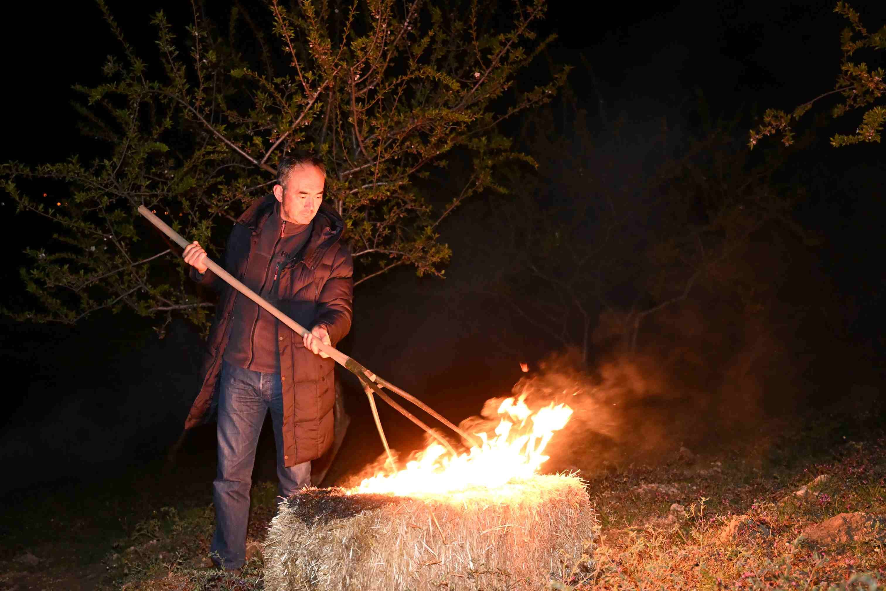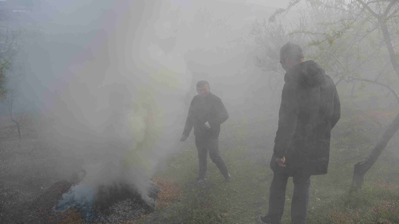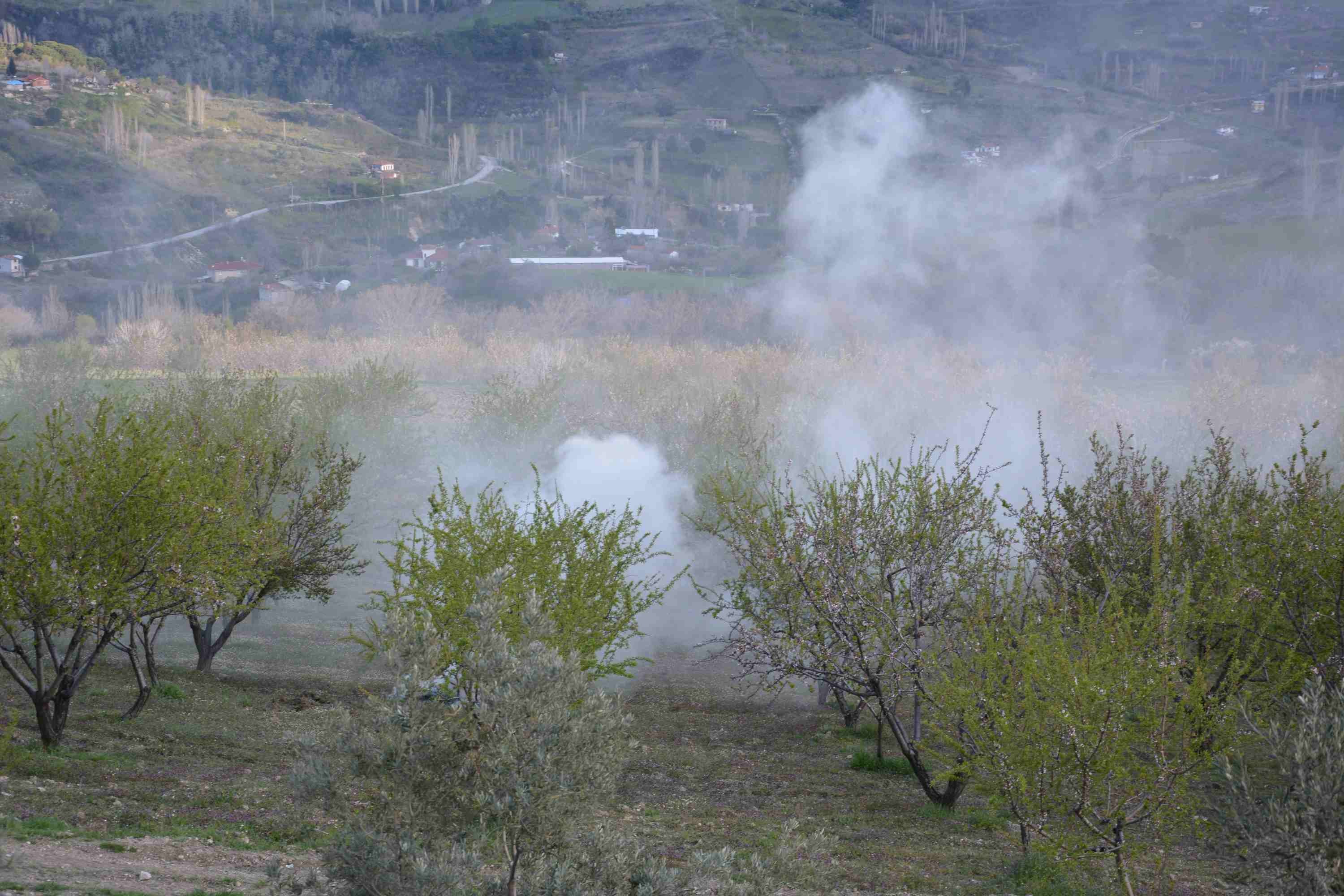 Çiçeklenme ve filizlenme dönemindeki badem ağaçlarının zarar görmemesi için üreticiler, saman balyaları ve badem kabuklarını yakarak dumanlama yöntemi uyguluyor. Gece saatlerinde başlayan bu çalışmalar, sabahın ilk ışıklarına kadar aralıksız devam ediyor. Amaç, bahçe içerisindeki sıcaklığı birkaç derece artırarak don riskini azaltmak.