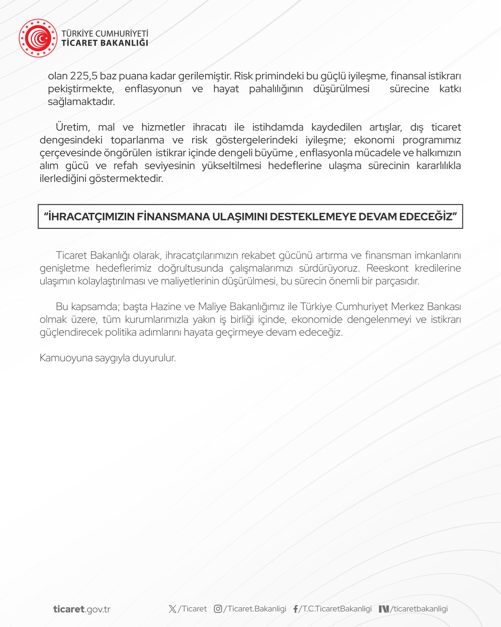 “Risk primindeki bu güçlü iyileşme, finansal istikrarı pekiştirmekte, enflasyonun ve hayat pahalılığının düşürülmesi sürecine katkı sağlamaktadır.”