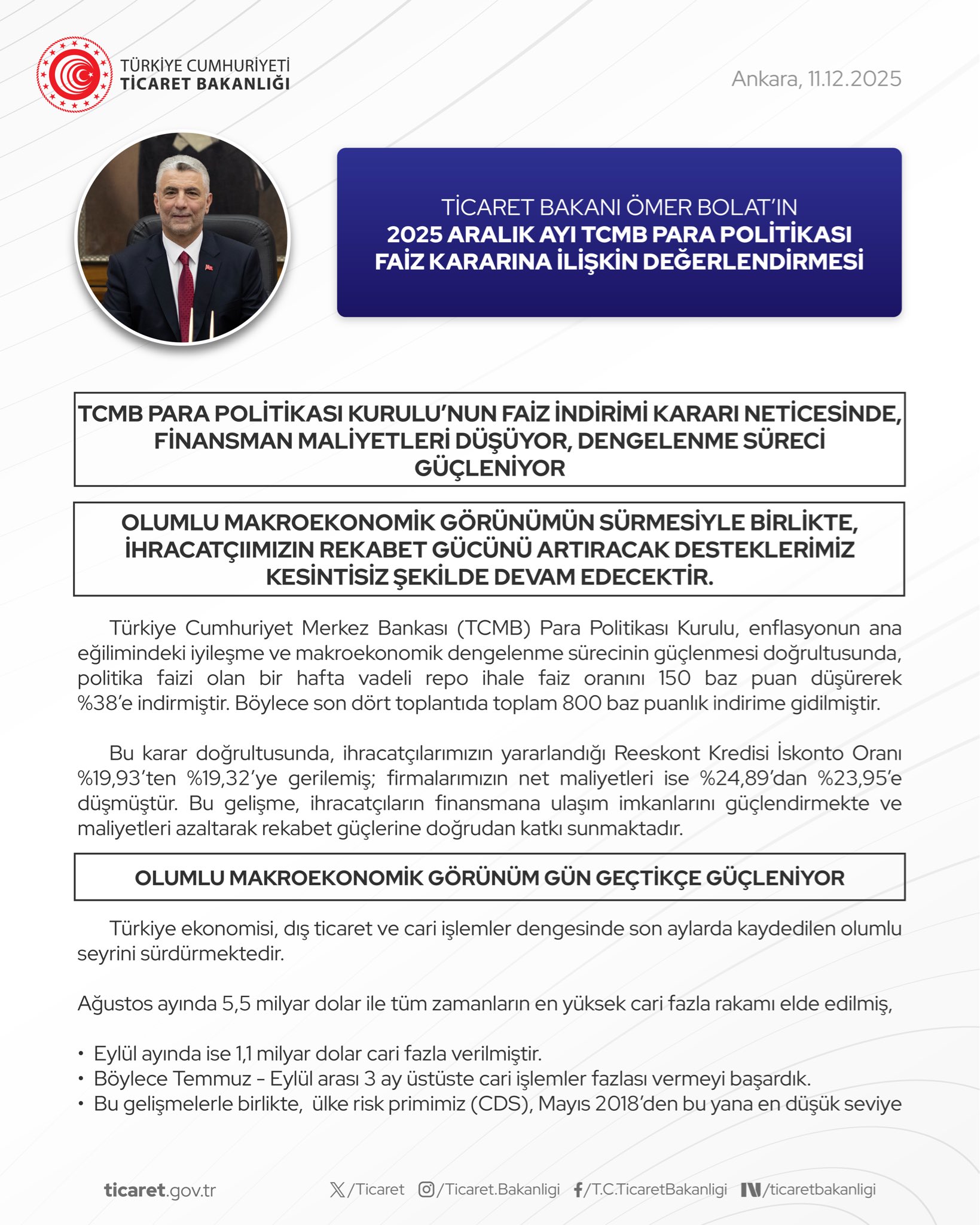 Bolat, reeskont kredi maliyetlerindeki düşüşün ihracatçıların finansmana erişimini kolaylaştırdığını ve rekabet güçlerini artırdığını belirterek Türkiye ekonomisinin dış ticaret ve cari dengede güçlü bir görünüm sergilediğini aktardı.