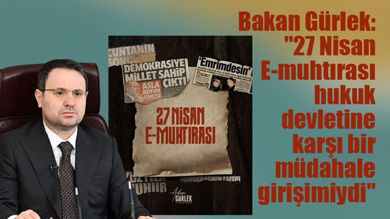 Cumhurbaşkanı Erdoğan’ın duruşunun Türkiye’de darbe ve muhtıra zihniyetine karşı verilen mücadelenin en önemli kırılma anlarından biri olarak tarihe geçtiğini belirten Bakan Gürlek, "27 Nisan’da ortaya konan irade, 15 Temmuz’da milletimizin destansı direnişiyle daha da güç kazandı. Adalet Bakanlığı olarak milli iradeyi esas almaya, demokrasimizin üzerinde hiçbir vesayet gölgesine izin vermemeye kararlılıkla devam ediyor; 27 Nisan E-muhtırasının yıl dönümünde demokrasimize sahip çıkma kararlılığımızı bir kez daha vurguluyoruz. Bu vesileyle her türlü anti-demokratik girişimin karşısında olduğumuzu; hukuktan, adaletten ve milli iradeden asla taviz vermeyeceğimizi; vesayet ve darbe dönemlerinin artık tamamen geride kaldığını en güçlü şekilde ifade ediyoruz" dedi.