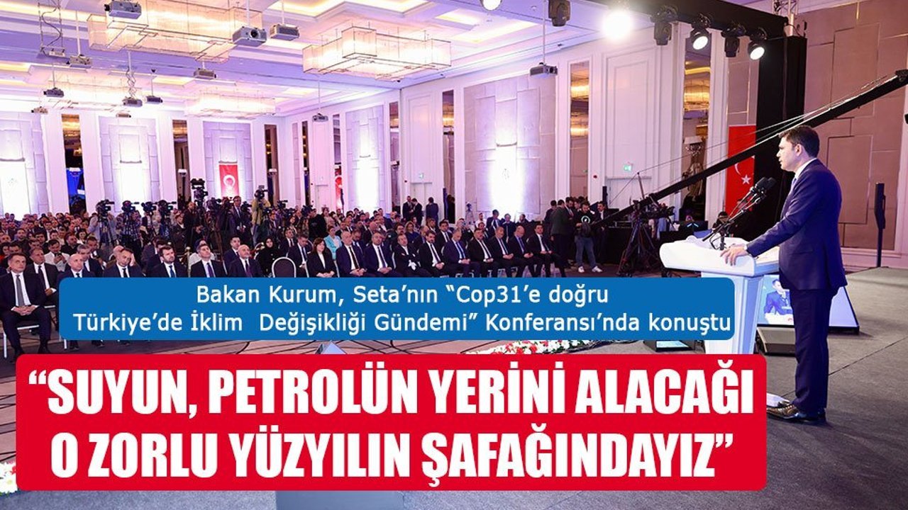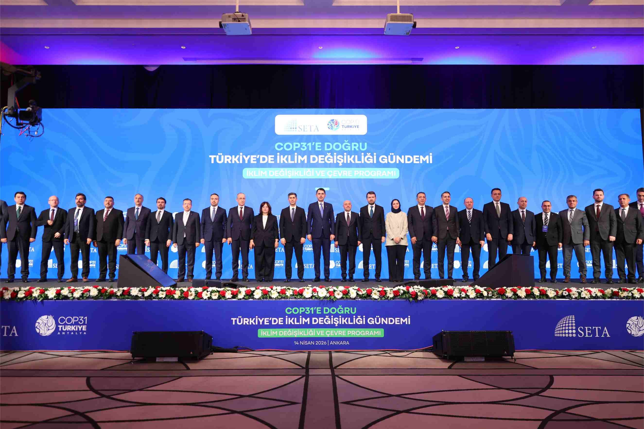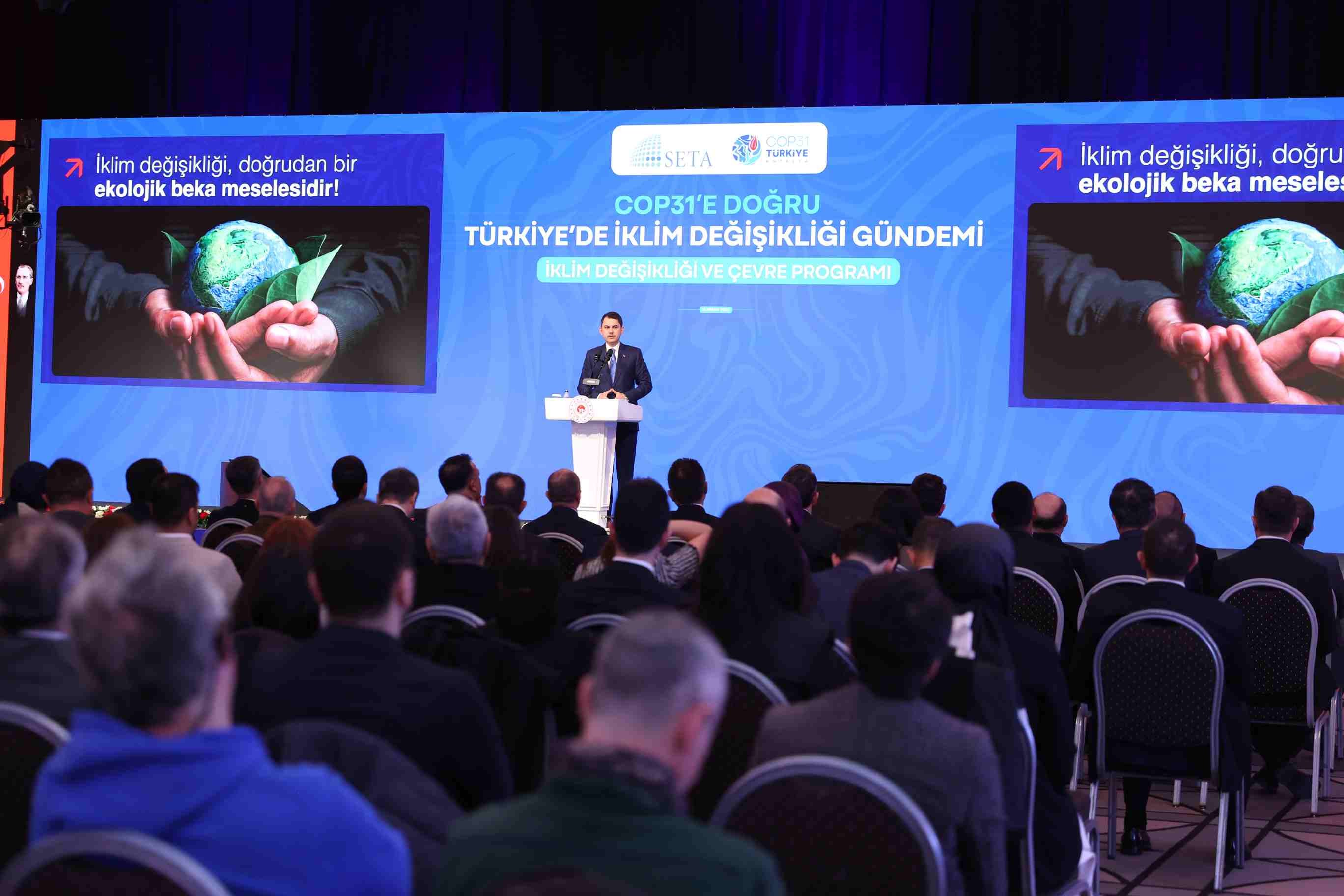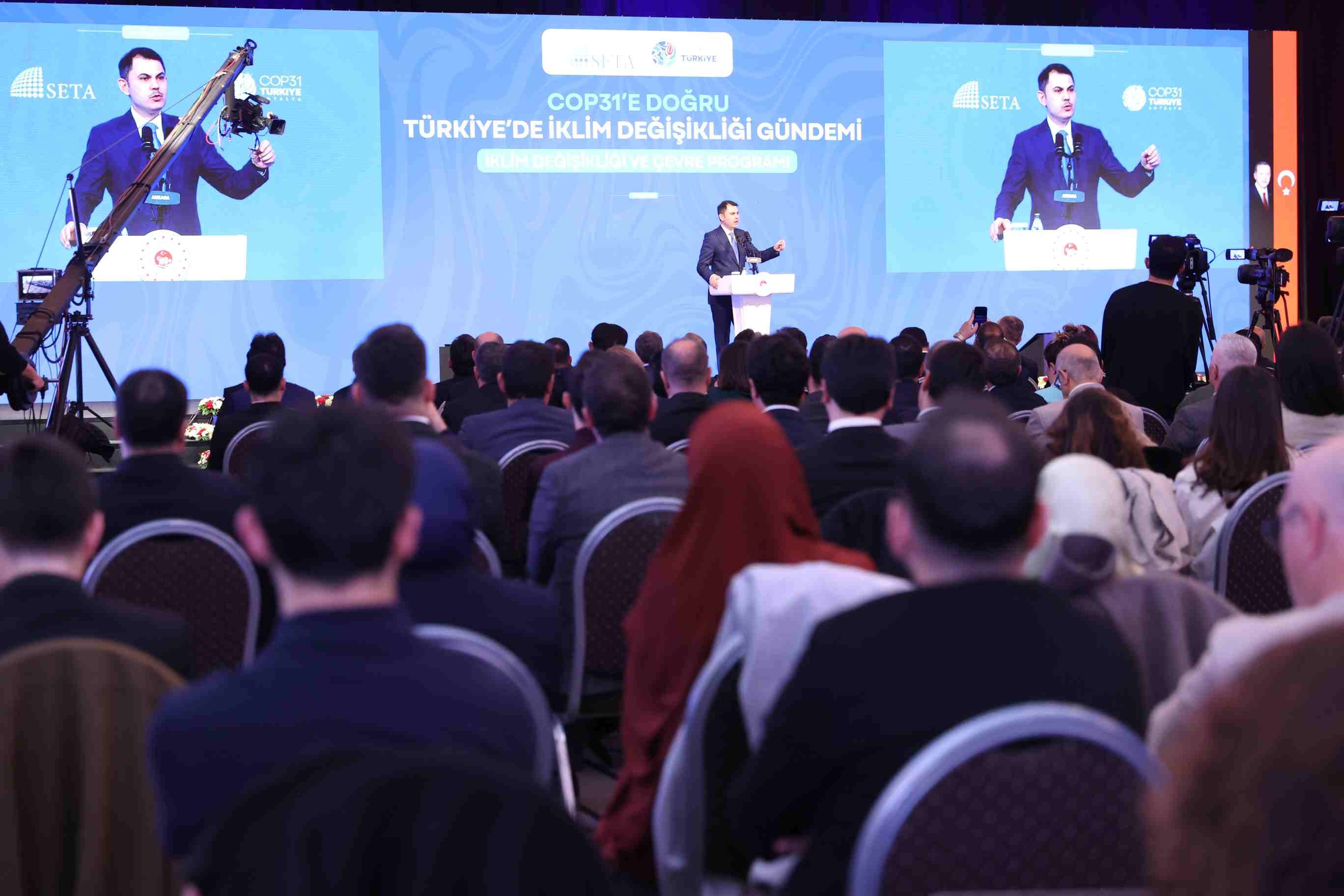 SETA’nın düzenlediği “COP31’e Doğru Türkiye’de İklim Değişikliği Gündemi” başlıklı konferansta konuşan COP31 Başkanı ve Çevre, Şehircilik ve İklim Değişikliği Bakanı Murat Kurum, “Ortadoğu’dan Orta Asya’ya, Balkanlar’dan Kafkasya’ya uzanan bu zorlu coğrafyada; suyuna hakim olan, toprağını yeşil tutan ve doğayı ezmeden enerji üreten devletler, geleceğin oyun kurucuları olacaktır. Bugün bölgemizde yaşanan savaşlar enerji krizini tetikliyor; anlamsız ve hiçbir insani duygu taşımayan asimetrik çatışmalar petroldeki istikrarsızlığı arttırıyor. Bu da bize gösteriyor ki; bu istikrarsızlık süreci ve iklim değişikliği doğrudan bir ekolojik beka meselesidir. Türk devlet aklı, iklim kriziyle mücadeleyi, savunma yapılması gereken bir cephe, fırsatlar sunan bir kalkınma meselesi olarak görmektedir” dedi. Bakan Kurum, COP31’de Sıfır Atık, döngüsel ekonomi, yeşil sanayileşme ve dirençli şehirlerin eylem planının önemli başlıklarından olacağını belirterek, “Biz COP31 ile yeni şeyler söylemek istiyoruz; sadece laf değil, eylem istiyoruz. Türkiye’nin küresel öze dönüş çağrısı; toprağın suyla, insanın doğayla yeniden helalleşmesidir. Küresel öze dönüş çağrımız; sanayinin vicdanla, teknolojinin adaletle tanışmasıdır. Ve bu çağrı; Türkiye’nin ortak evimizin geleceğine vurduğu, ebediyen silinmeyecek bir vicdan ve adalet mührüdür” diye konuştu.