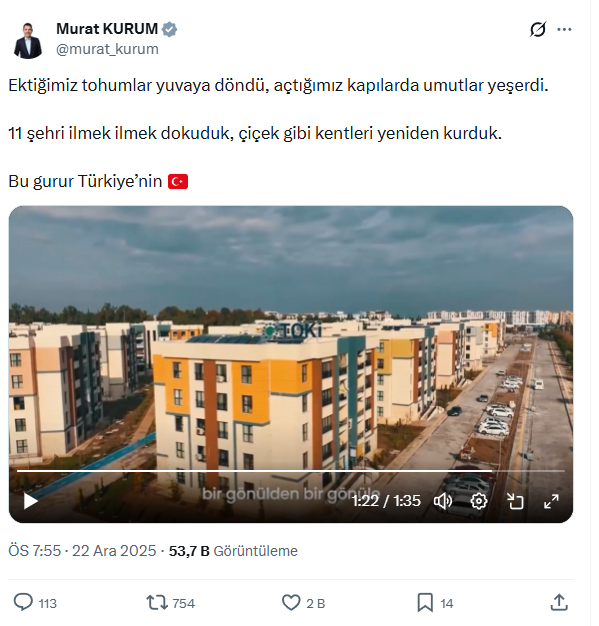 Bakan Kurum'un, “Ektiğimiz tohumlar yuvaya döndü, açtığımız kapılarda umutlar yeşerdi. 11 şehri ilmek ilmek dokuduk, çiçek gibi kentleri yeniden kurduk. Bu gurur Türkiye’nin” mesajının yer aldığı paylaşımda 11 ilde tamamlanan afet konutlarının görüntüleri kullanıldı. Cumhurbaşkanı Recep Tayyip Erdoğan’ın “Bize güvenin, bize inanın. Biz vatandaşımızı darda, yoklukta, sokakta bırakmadık ve bırakmayız” mesajı da yer aldı.