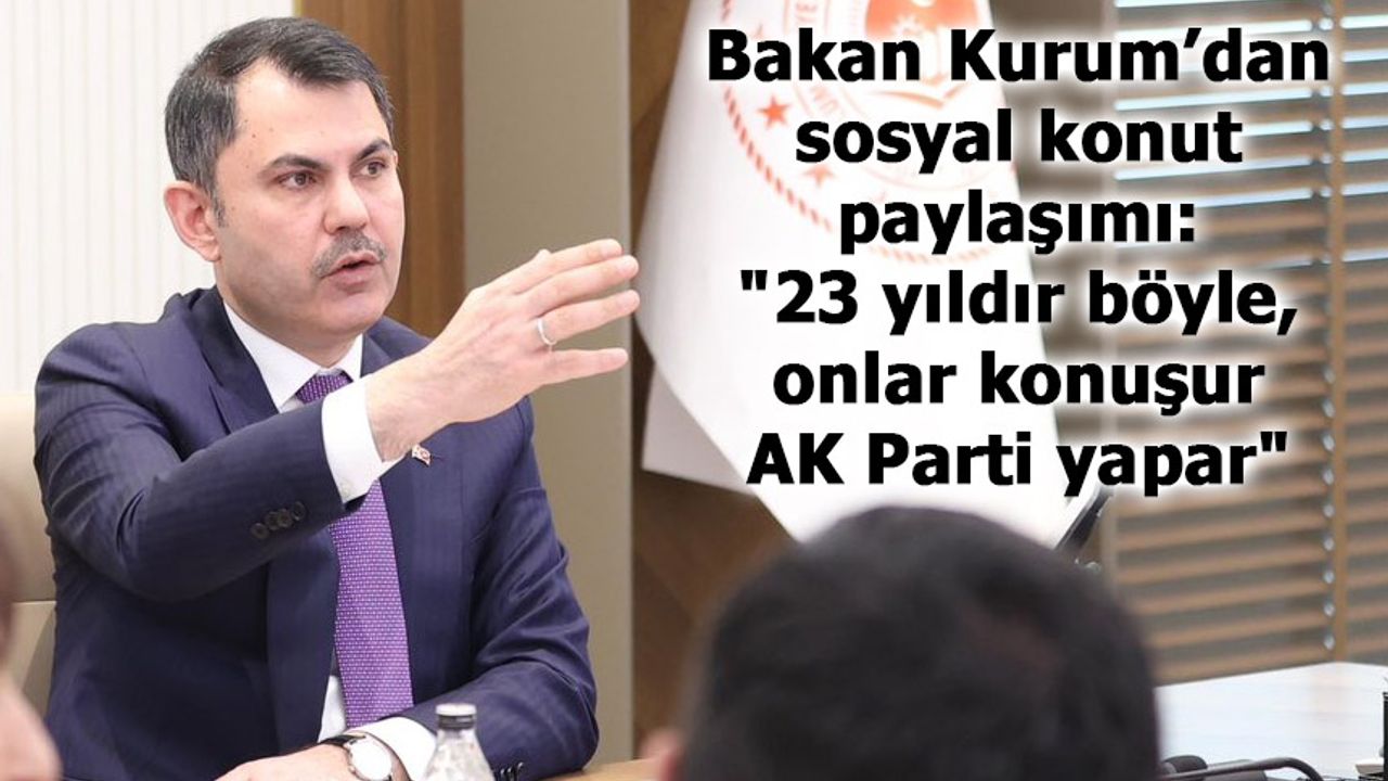 Çevre, Şehircilik ve İklim Değişikliği Bakanı Murat Kurum, sosyal konut projesiyle ev sahibi olan vatandaşların görüntülerini sosyal medya hesabından paylaştı. Bakan Kurum, "23 yıldır böyle Onlar konuşur, AK Parti yapar" ifadelerini kullandı.