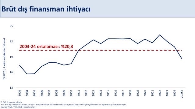 Bakan Şimşek, sosyal medya hesabından yaptığı paylaşımda, "Ağustosta 5,5 milyar dolar ile tarihimizin en yüksek aylık cari fazlasını verdik. Böylece yıllık cari açık 18,3 milyar dolara gerilerken 2023 yılı Mayıs ayına göre iyileşme 37,6 milyar dolar oldu. Cari açıktaki bu iyileşme ülkemizin dış finansman ihtiyacını azaltıyor. Nitekim 2023 yılı Haziran ayında milli gelire oranla yüzde 23 olan brüt dış finansman ihtiyacının, 2025’te yaklaşık yüzde 17’ye gerileyeceğini öngörüyoruz. Azalan döviz ihtiyacı, artan dış finansmana erişim ve yüksek rezervlerimiz sayesinde makro finansal dayanıklılığımız güçleniyor" ifadelerine yer verdi.