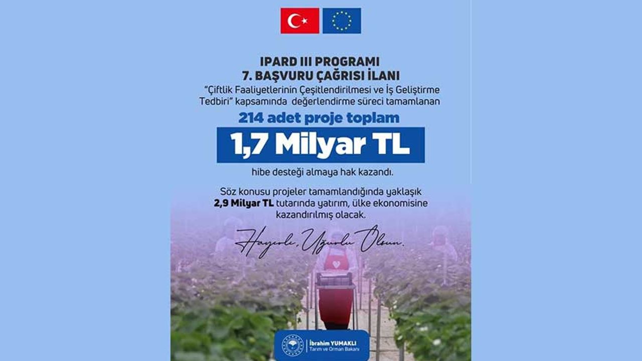 Bakan Yumaklı, sosyal medya hesaplarından yaptığı paylaşımda, IPARD III Programı 7’nci Başvuru Çağrı Dönemi kapsamında “Çiftlik Faaliyetlerinin Çeşitlendirilmesi ve İş Geliştirme Tedbiri”ne başvuran projelerin değerlendirme sürecinin tamamlandığını duyurdu. Buna göre 214 proje, 1,7 milyar lira hibe desteği almaya hak kazandı.