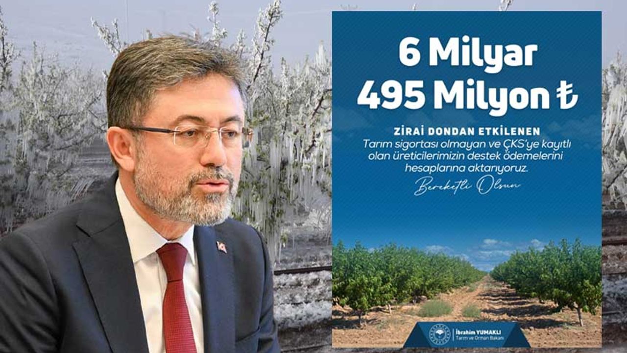 Tarım ve Orman Bakanı İbrahim Yumaklı, kötü hava şartlarından etkilenen üreticilere yönelik maddi destek ödemelerini sürdürdüklerini belirtti. Bakan Yumaklı, bu kapsamda tarım sigortası bulunmayan Çiftçi Kayıt Sistemi’ne (ÇKS) kayıtlı üreticilere önceki ödemelerin devamı olarak 6 milyar 495 milyon lira daha destek ödemesi aktardıklarını açıkladı. Bakan Yumaklı, sosyal medya hesabından konuya ilişkin yaptığı açıklamada şu ifadelere yer verdi: "Zirai dondan etkilenen üreticilerimizin yanında olmaya devam ediyoruz. Tarım sigortası bulunmayan Çiftçi Kayıt Sistemi’ne (ÇKS) kayıtlı üreticilerimize önceki ödemelerin devamı olarak 6 milyar 495 milyon lira daha aktarıyoruz. Bu destekle birlikte üreticilerimize toplamda 20 milyar 423 milyon lira zirai don destek ödemesi gerçekleştirdik. Zirai don kapsamındaki destek ödemelerine devam edeceğiz."