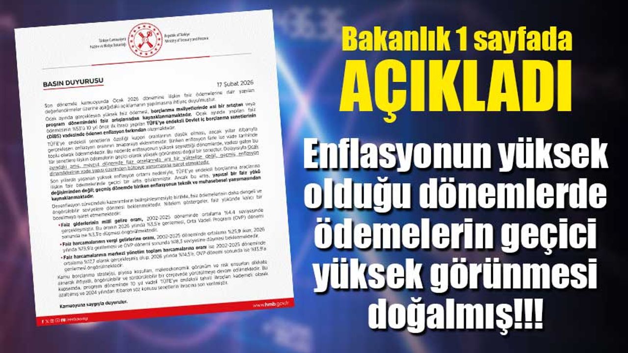 Bakanlık, ocak ayında gerçekleşen yüksek faiz ödemesinin mevcut dönemde faiz oranlarında ani bir artıştan değil, geçmiş enflasyon dinamiklerinin vade yapısı üzerinden bütçeye yansımasından kaynaklandığını bildirdi.
