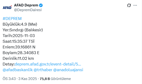 Afet ve Acil Durum Yönetimi Başkanlığı’nın (AFAD) verilerine göre, depremin merkez üssü Balıkesir’in Sındırgı ilçesi olarak kaydedildi. Yer kabuğunun 11,02 kilometre derinliğinde gerçekleşen sarsıntı, kısa süreli panik yaşanmasına neden oldu.
