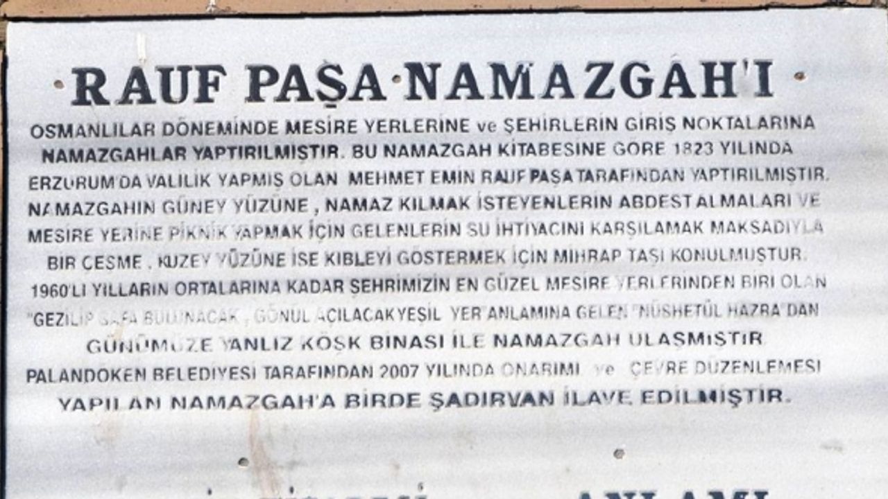 Erzurum’da da ceddimizden miras kalan bir namazgâh var. Bu namazgâh Yukarı Köşk Mahallesinde, Köşk Aile Bahçesi’nin güneyinde bir parkın içinde muhafaza ediliyor. Erzurum’da az bilinen Rauf Paşa Namazgâhı, mihrap taşı üzerindeki kitabesine göre H.1239 - M. 1823 tarihinde, Erzurum’da Valilik yapmış olan Mehmet Emin Rauf Paşa tarafından yaptırılmıştır. Mihrap taşının güney yüzü de çeşmedir. Ancak çeşme günümüze ulaşmamıştır. Kıble taşı eksiksiz ve hasarsız dikildiği günden bugüne gelen ve zarar görmeyen Rauf Paşa Namazgâhı için etrafı çevrilerek ve üstü kubbe ile örtülmüştür. Bir çok vatandaşın mihrap taşını ve koruyucu yapıyı kabir sandığı da ifade ediliyor. Bu amaçla yıllar önce namazgâhın yanına açıklayıcı bilgi konuldu.