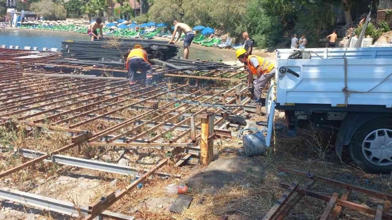 Yahşi Mahallesi Kargı Plajı’nda, devletin hüküm ve tasarrufunda bulunan kumsal ve deniz yüzeyinde 500 metrekarelik çelik ve ahşap konstrüksiyondan imal edilmiş kaçak ve ruhsatsız iskele belediye ekipleri tarafından kaldırılıyor.