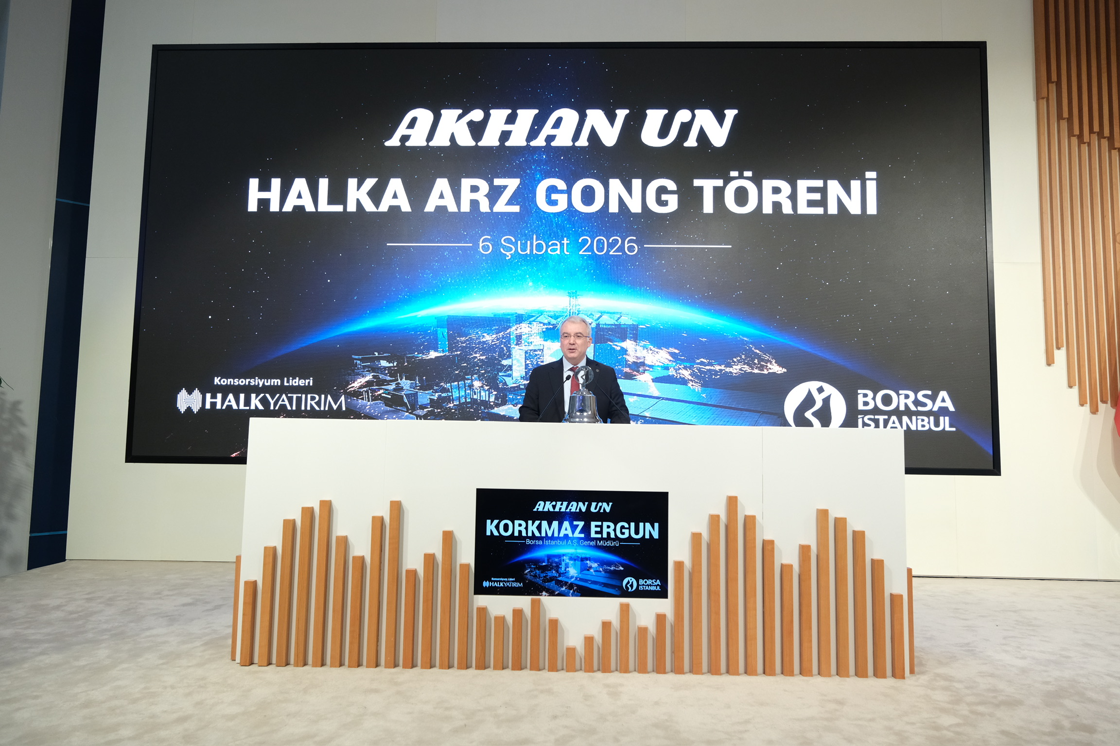 Borsa İstanbul A.Ş. Genel Müdürü Korkmaz Ergun törende yaptığı konuşmasında, “Akhan Un’un Borsamızda işlem görmeye başlaması nedeniyle düzenlediğimiz halka arz törenine, Borsamıza hoş geldiniz. Akhan Un, uzun yıllar boyunca un üretimi alanında faaliyetlerini sürdürmüş ve yıllar içerisinde üretim kapasitesini artırmıştır. Farklı sektörlerden farklı büyüklükteki şirketler, yatırımlarını gerçekleştirmek, şeffaflık ve kurumsallaşma amacıyla sermaye piyasalarına gelmektedir.