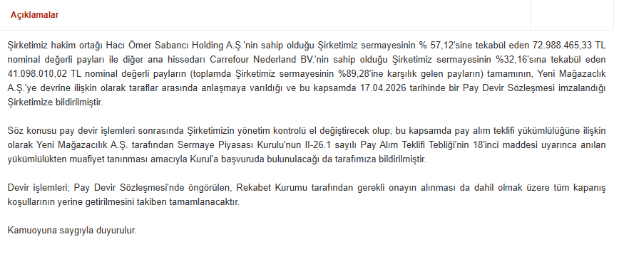 KAP'a yapılan açıklamada: "Şirketimiz hakim ortağı Hacı Ömer Sabancı Holding A.Ş.'nin sahip olduğu Şirketimiz sermayesinin % 57,12'sine tekabül eden 72.988.465,33 TL nominal değerli payları ile diğer ana hissedarı Carrefour Nederland BV.'nin sahip olduğu Şirketimiz sermayesinin %32,16'sına tekabül eden 41.098.010,02 TL nominal değerli payların (toplamda Şirketimiz sermayesinin %89,28'ine karşılık gelen payların) tamamının, Yeni Mağazaclık A.Ş.'ye devrine ilişkin olarak taraflar arasında anlaşmaya varıldığı ve bu kapsamda 17.04.2026 tarihinde bir Pay Devir Sözleşmesi imzalandığı Şirketimize bildirilmiştir.