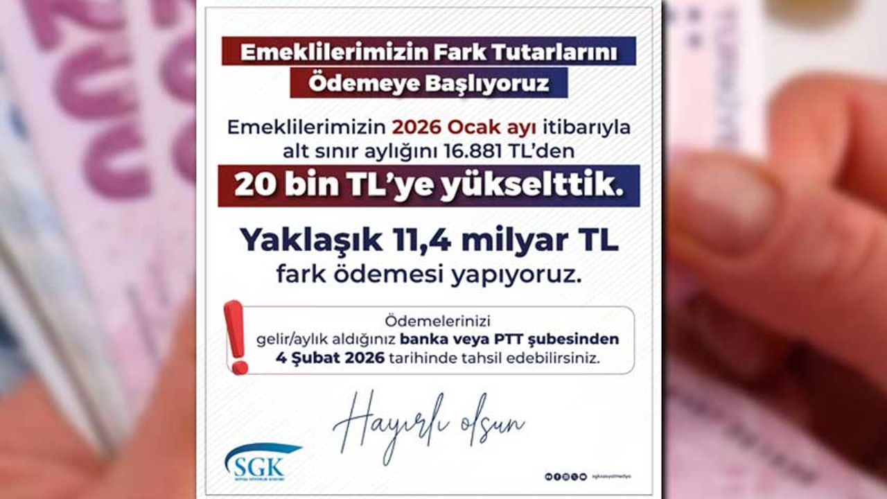 SGK’dan yapılan açıklamada, emekliler ve hak sahiplerinin fark ödemelerini maaş aldıkları banka hesaplarından veya PTT şubelerinden tahsil edebileceği belirtildi. Açıklamada, “Emeklilerimize ve hak sahiplerine fark tutarlarını ödüyoruz. Ödemelerinizi gelir/aylık aldığınız banka ve PTT şubesinden 4 Şubat 2026 tarihinde çekebilirsiniz” ifadelerine yer verildi.