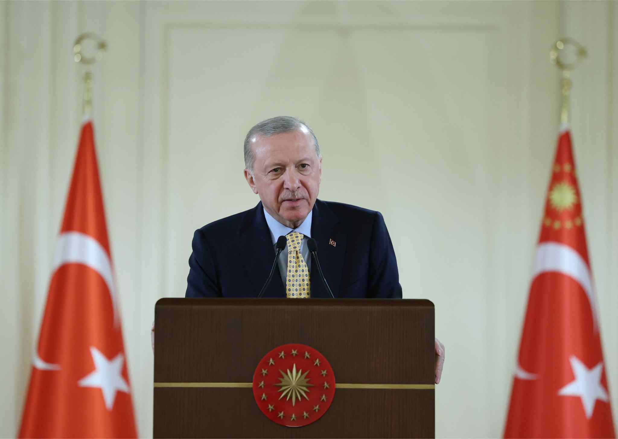 Türkiye’nin artık birçok alanda kendi ürünlerini yapmaya başladığını, bir karar alacağı zaman kimseye danışmak zorunda olmadığını söyleyen Erdoğan, "Bugün geldiğimiz noktada Türkiye kendi güvenliği için yalnızca sınırları dahilinde değil sınırların ötesinde de her türlü adımı atmaktadır. Nerede bir tehdit ve tehlike varsa kimseden icazet almadan kaynağında etkisiz hale getiriyoruz. Kahraman ordumuzun ve diğer güvenlik birimlerimizin operasyonları sayesinde terör örgütlerinin hareket kabiliyetini ciddi ölçüde sınırlandırdık. Savunma sanayinde 23 yılda geldiğimiz seviye zaten ortada. Daha önce yüzde 80 oranında yurt dışına bağımlı olduğumuz bu alanda şimdi yüzde 80 yerlilik oranına ulaştık. Bugün İHA'lar, SİHA'lar, füzeler, roketler, gemiler, helikopterler ve tanklar dahil hemen her alanda kendi ihtiyaçlarımızı kendimiz karşılayabiliyoruz. İnşallah yarın sıra savaş uçaklarına, uçak gemilerine gelecek. Cenabı Allah'a sonsuz şükürler olsun. Azmettik, çalıştık, kendimize güvendik ve işte 23 yılda buralara geldik. Aziz kardeşlerim, şimdi sahadaki tüm bu kazanımları kalıcı hale getirmek istiyoruz" dedi.