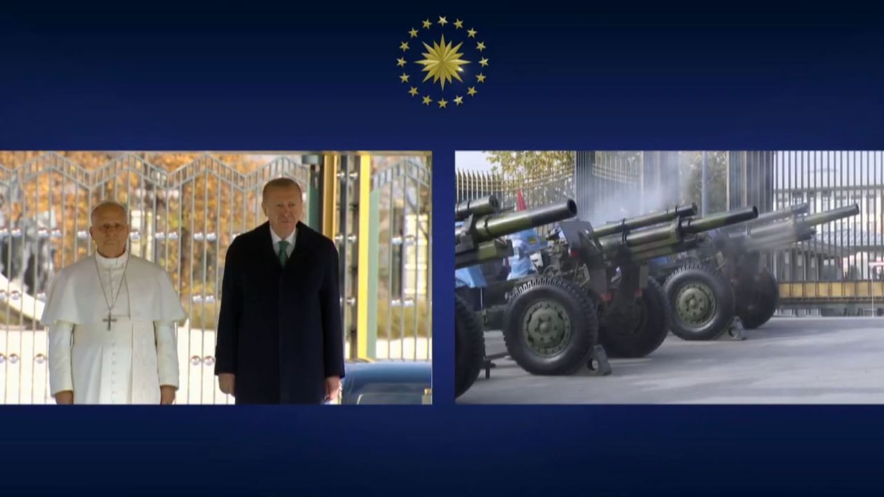 Papa 14. Leo’nun bulunduğu makam aracını Külliye’ye girişte süvariler karşıladı. Süvariler, konuk devlet başkanına protokol kapısına kadar eşlik etti. Cumhurbaşkanı Erdoğan, Papa 14. Leo’yu ana giriş kapısında karşılarken iki lider, tören alanındaki yerlerini aldı. Ardından 21 pare top atışı eşliğinde Türkiye ve Vatikan’ın milli marşları çalındı. Papa 14. Leo, Muhafız Alayı Tören Kıtası’nı “Merhaba Asker” diyerek selamladı.