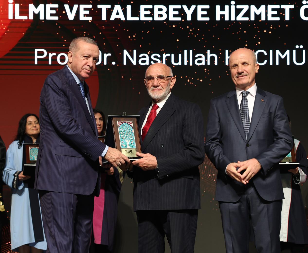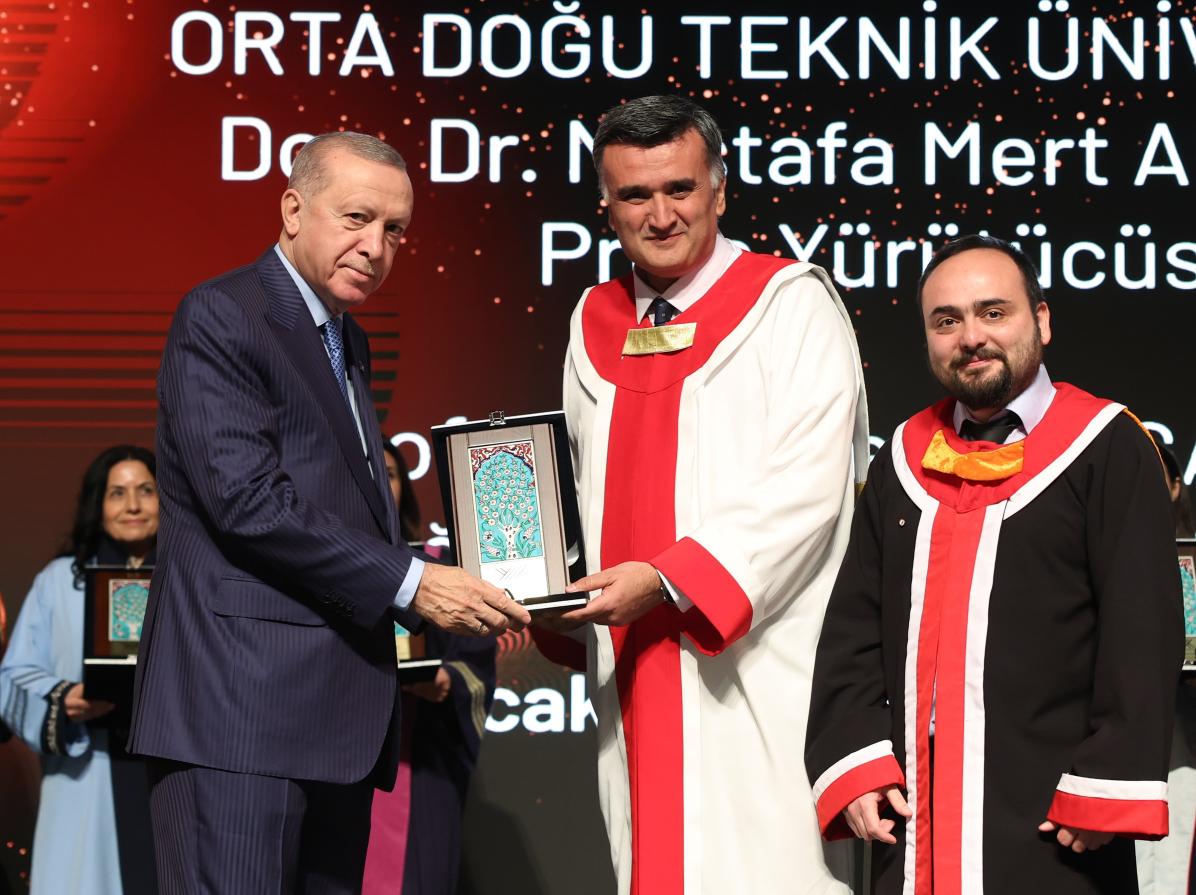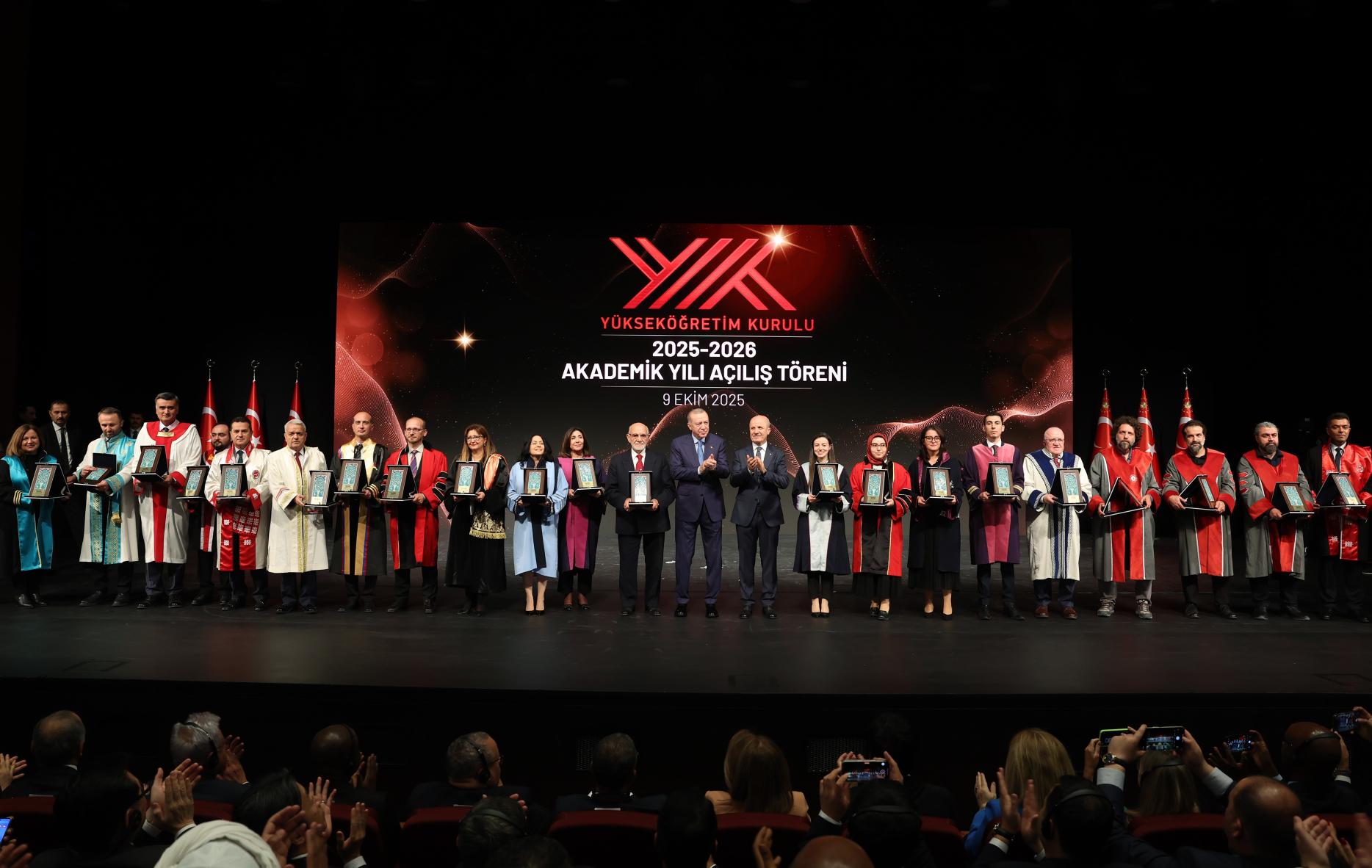 Törenin sonunda YÖK 2025 Üstün Başarı Ödülleri sahiplerini bulurken, Başkan Erdoğan akademisyenlere ödüllerini takdim etti.