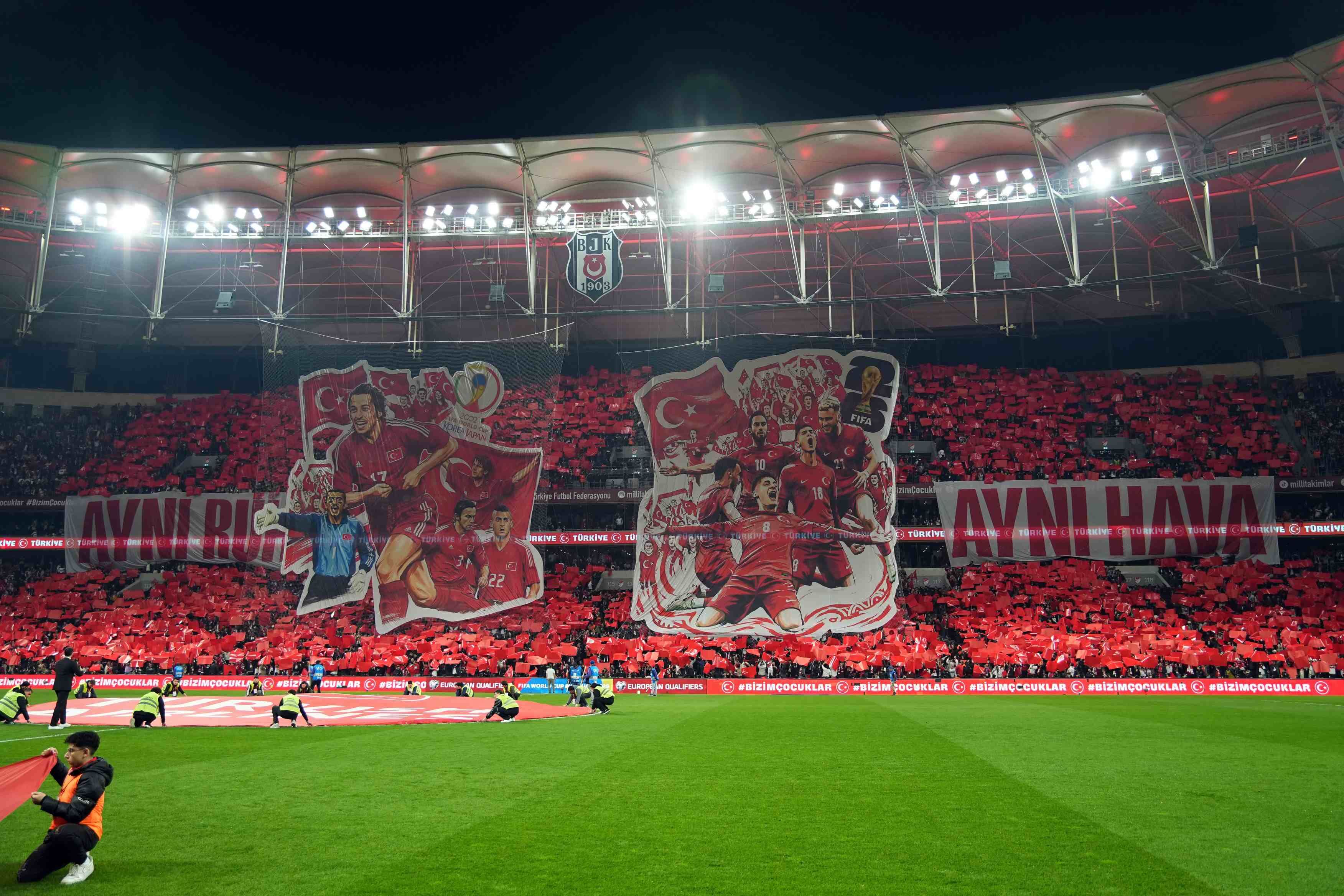 Karşılaşma öncesinde tribünler tamamen dolarken, “Aynı ruh, aynı hava” temalı koreografi geceye damga vurdu. 2002 Dünya Kupası kadrosu ile günümüz milli takımının birlikte yer aldığı görseller büyük alkış aldı. Koreografi sırasında Tarkan’ın “Bir oluruz yolunda” şarkısı çalındı ve statta duygusal anlar yaşandı.