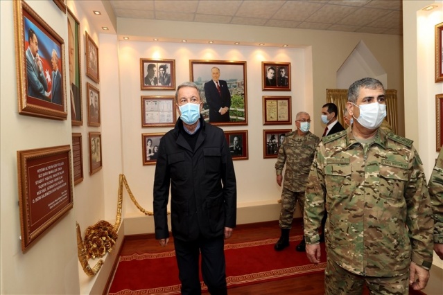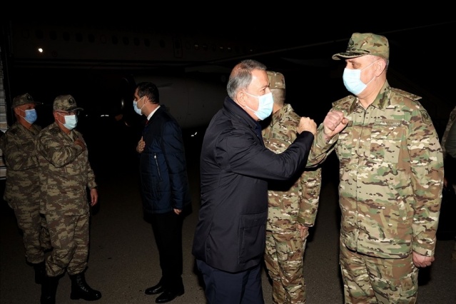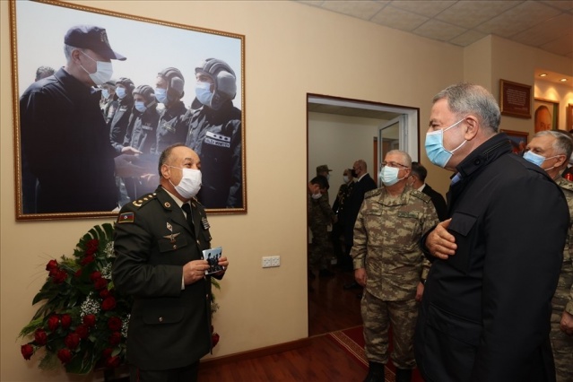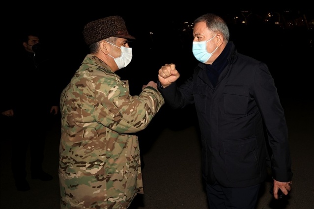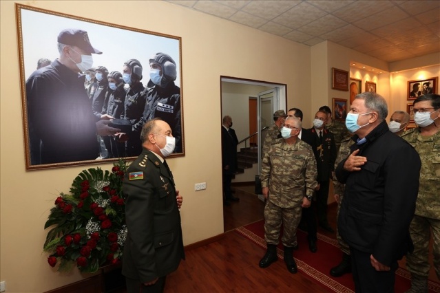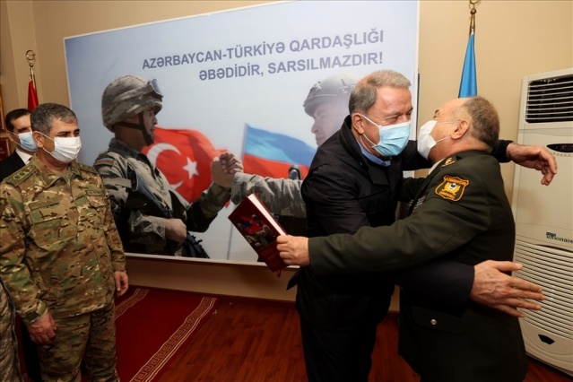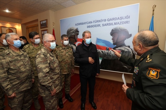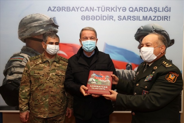 Bakan Akar, beraberinde Genelkurmay Başkanı Orgeneral Yaşar Güler ve kuvvet komutanları ile sınır birliklerindeki inceleme ve denetlemelerinin ardından gece Azerbaycan’a gitti. Haydar Aliyev Havalimanı’nda Azerbaycan Savunma Bakanı Zakir Hasanov ve diğer yetkililer tarafından karşılanan Akar ve komutanlar, Azerbaycan EDOK Komutanlığına geçerek burada düzenlenen askeri törene katıldı. Azerbaycan Silahlı Kuvvetleri personelinin yanı sıra Türkiye-Rusya arasında kurulacak Ortak Merkez’de görev yapacak Türk askerlerinin de yer aldığı törende askerlere hitap eden Akar, tarihi şan ve şerefle dolu Azerbaycan ordusunu kazandığı zaferden dolayı tebrik etti. Ordusunu 44 gün süren harekat boyunca sürekli destekleyen Azerbaycan halkını da selamlayan Akar, sahnede yer alan panodaki yazıları işaret ederek, “Her şey açık ve net, Azerbaycan-Türkiye kardeşliği ebedidir, sarsılmaz. Bunu herkesin kafasına yazması lazım, kimse unutmasın, kimse yanlış hesap yapmasın” diye konuştu.