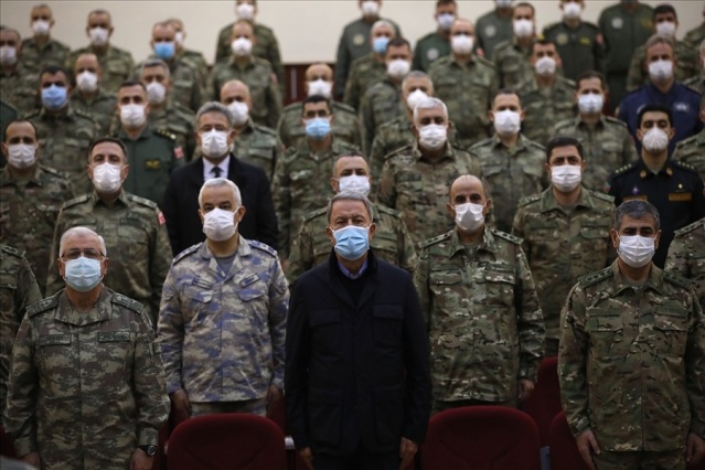 Milli Savunma Bakanı Hulusi Akar ve Türk Silahlı Kuvvetleri komuta kademesi, Türkiye-Rusya arasında kurulacak Ortak Merkez’de görev yapacak Türk askerleri ile Bakü’de bir araya geldi. Ortak Merkez’de ateşkesin gözetlenmesi ve takibinin gerçekleştirileceğini belirten Akar, “Ortak Merkez çalışmaya başladıktan sonra faaliyetlerimiz yoğunlaşacak ve Türk-Rus askerleri birlikte çalışmak suretiyle Azerbaycanlı kardeşlerimizin hakkını, hukukunu sonuna kadar müdafaa etme görevimizi yerine getireceğiz” dedi.
