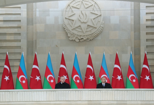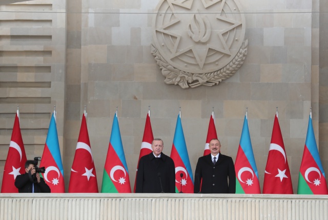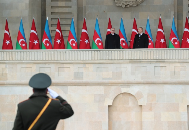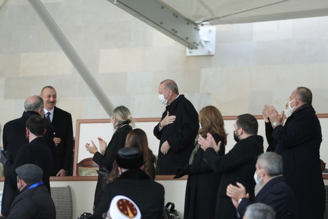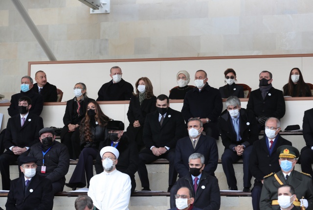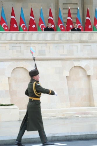 Erdoğan ve Aliyev, "Selam asker" diyerek törende bulunan askerleri selamladı. Azerbaycan Milli Marşı ve İstiklal Marşı'nın okunduğu törende Aliyev, halka seslendi. Cumhurbaşkanı Erdoğan'a teşekkür eden Aliyev, "Erdoğan'ın açıklamaları halkı çok sevindirdi.