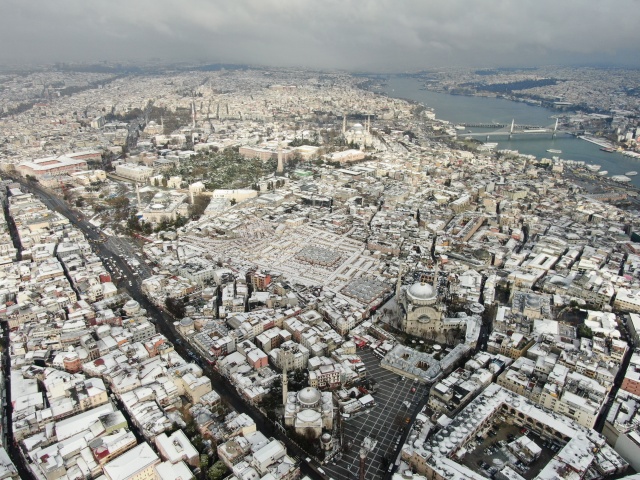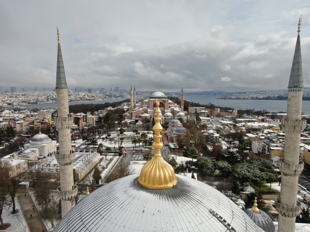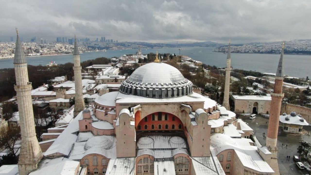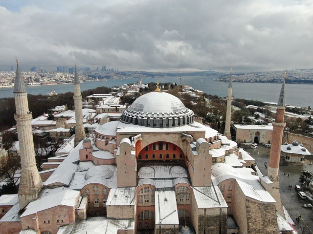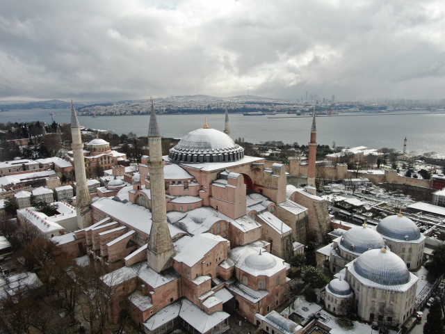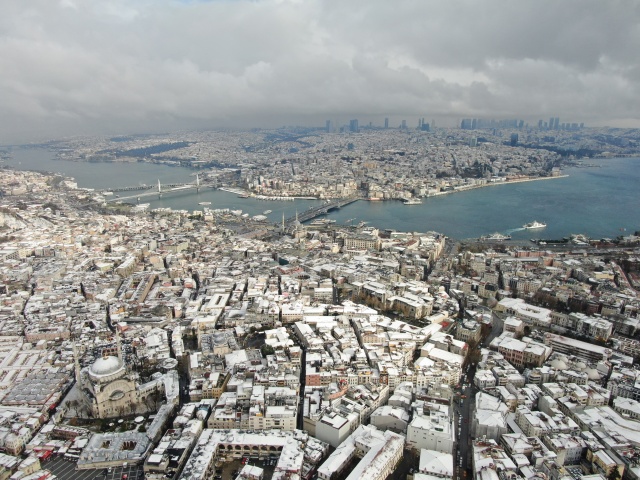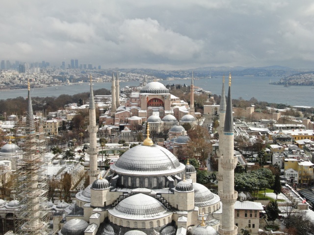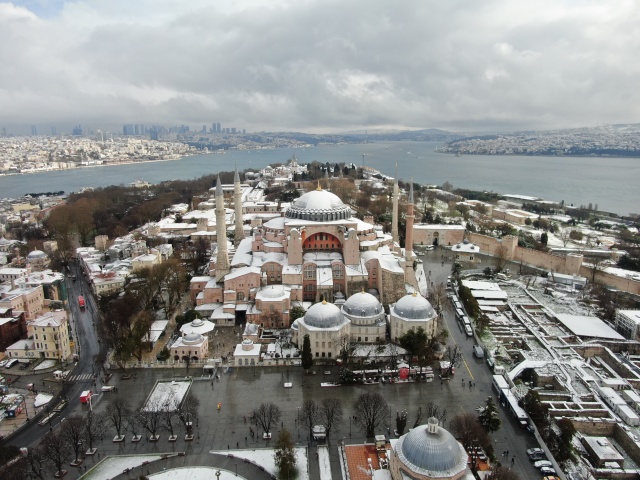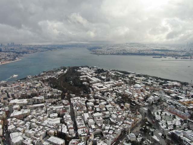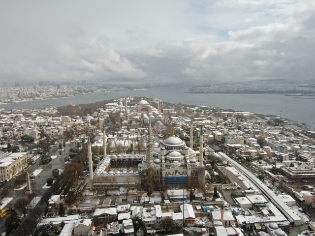 İstanbul'da etkili olan kar yağışıyla tarihi yarımada beyaza büründü. Sultanahmet Camii, Ayasofya-i Kebir Cami-i Şerifi ve Topkapı Sarayı'nı kaplayan beyaz örtü havadan görüntülendi.