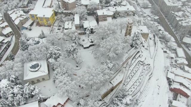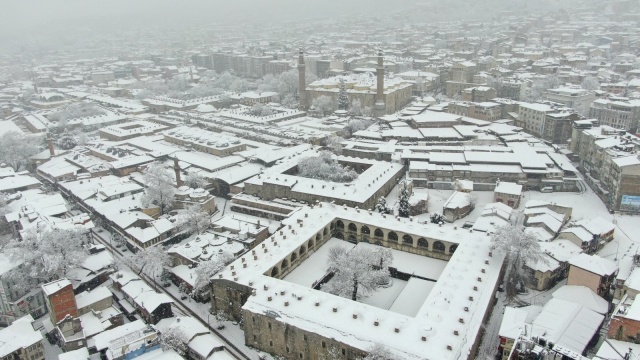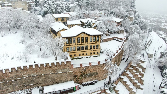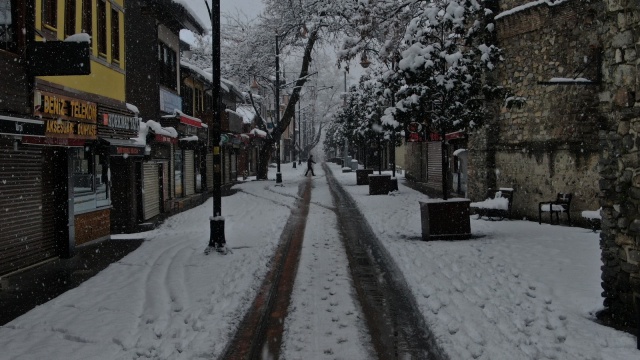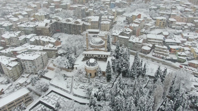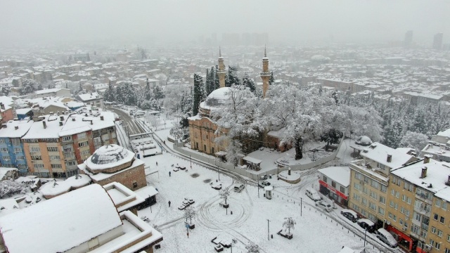Bursa’da dün akşam saatlerinden beri etkili olan kar yağışı devam ediyor. Pandemi kısıtlaması ile boş kalan cadde ve sokaklar beyaza bürünürken, tarihi yerlerde havadan görüntülendi.