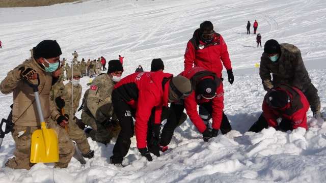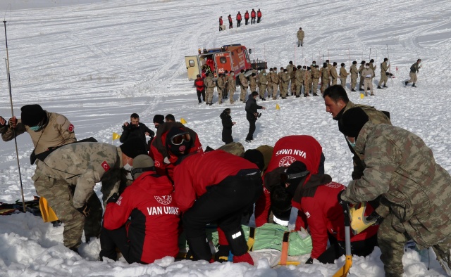 Afet ve Acil Durum Yönetimi Başkanlığı (AFAD) Van İl Müdürlüğü tarafından düzenlenen tatbikatta çığ timi güvenlik korucularının performansı nefesleri kesti.