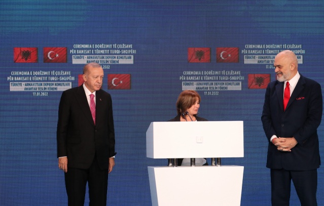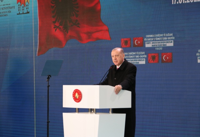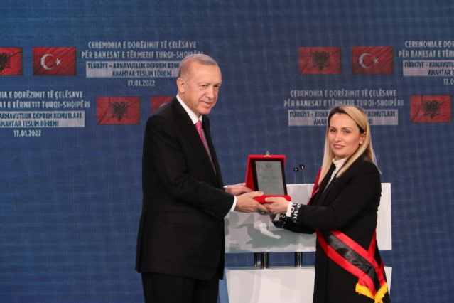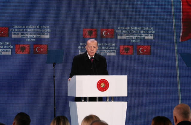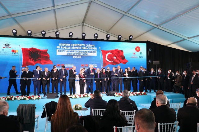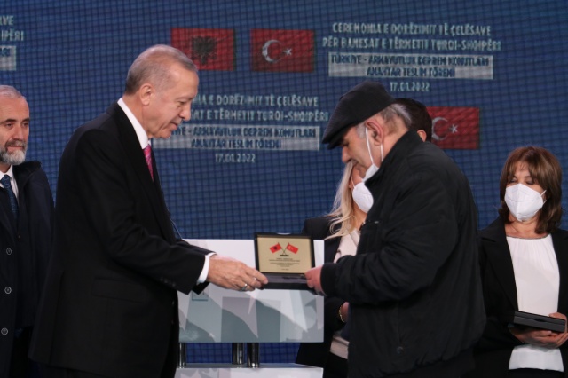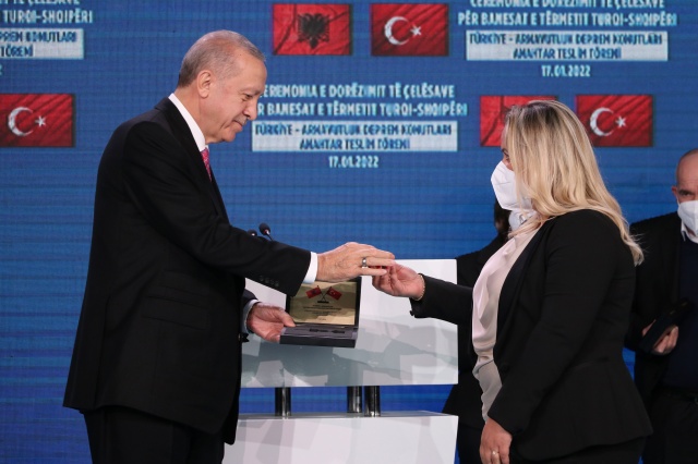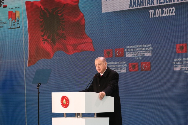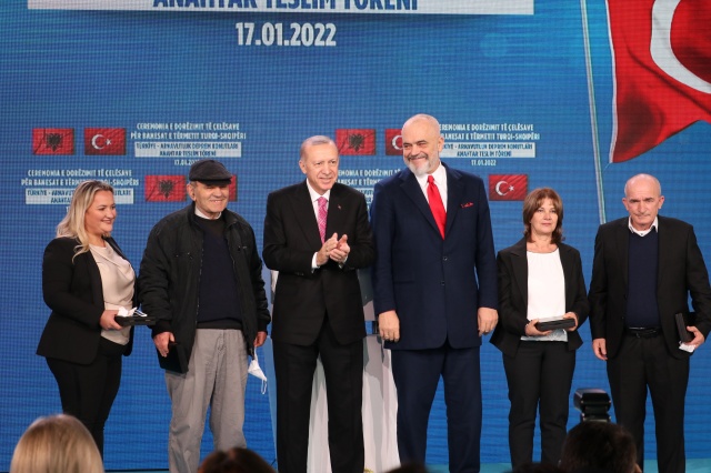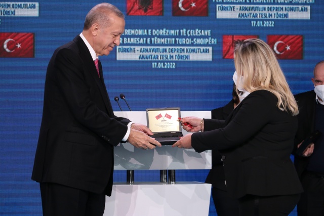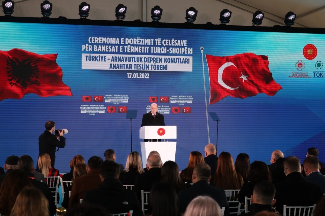Cumhurbaşkanı Recep Tayyip Erdoğan, Arnavutluk`un Laç kentinde Türkiye tarafından yaptırılan deprem konutlarının açılış töreninde yaptığı açıklamalarda, "Bugün toplamda 522 konutu içeren ve yaklaşık 42 milyon euroya mal olan evleri sizlere teslim ediyoruz" dedi.