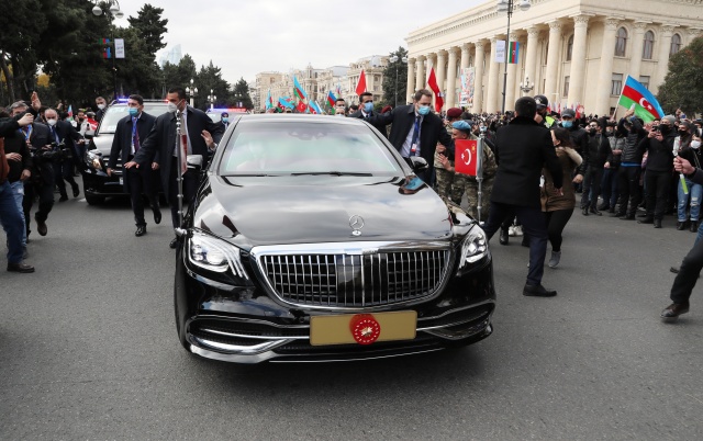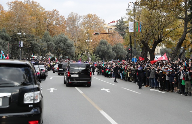 Cumhurbaşkanı Erdoğan beraberinde eşi Emine Erdoğan, Dışişleri Bakanı Mevlüt Çavuşoğlu, AK Parti Sözcüsü Ömer Çelik, AK Parti Genel Başkan Yardımcısı Mahir Ünal, Cumhurbaşkanlığı Sözcüsü İbrahim Kalın ve Cumhurbaşkanlığı İletişim Başkanı Fahrettin Altun ile birlikte Zafer Geçidi Töreni’ne giderken, yolda Azerbaycan halkının sevgi gösterilerine mazhar oldu. Azerbaycanlılar, Cumhurbaşkanı Erdoğan’a sevgilerini göstermek için sloganlar atıp Türk bayrakları salladı. Erdoğan, Azerbaycan halkını selamladı.