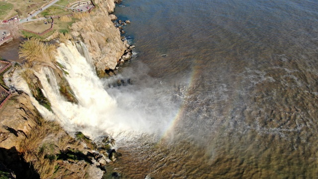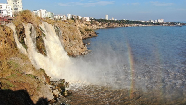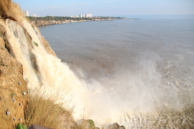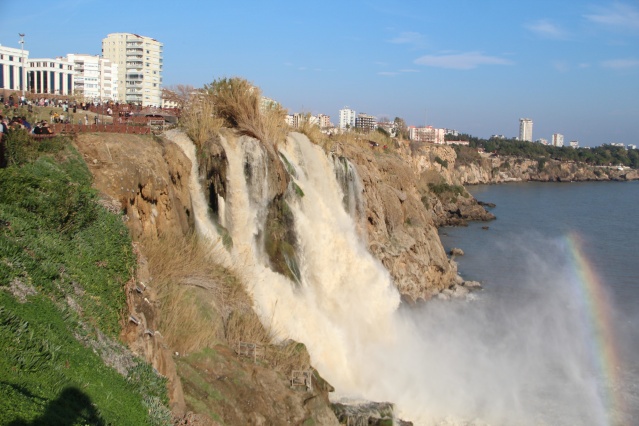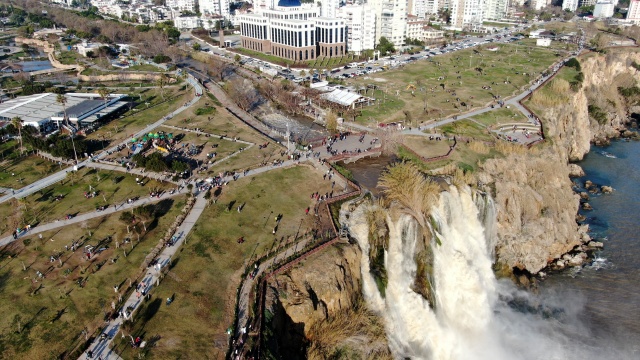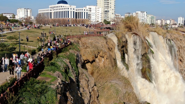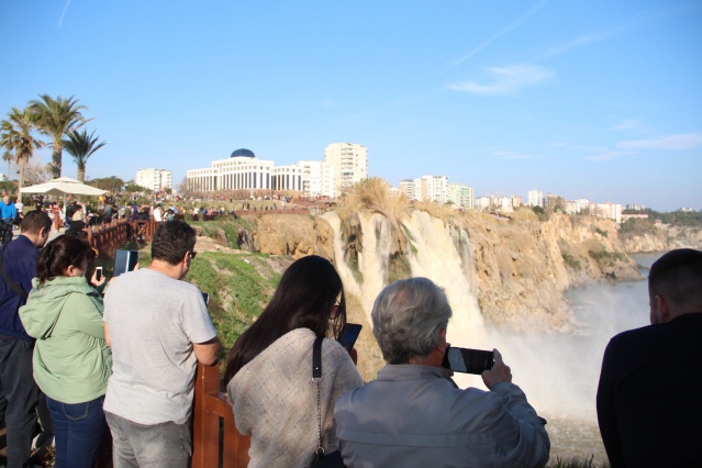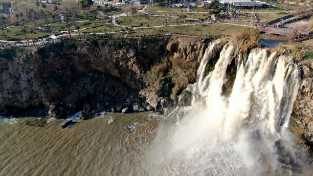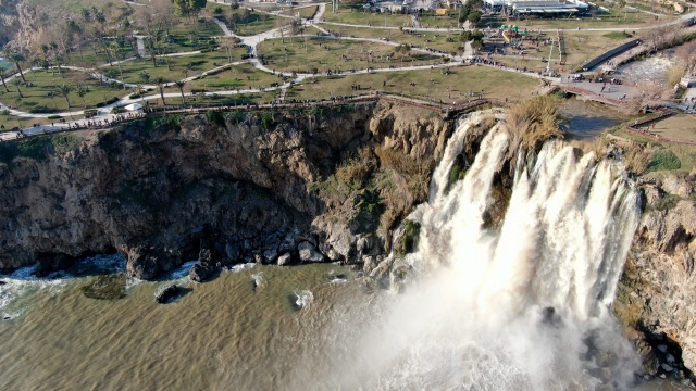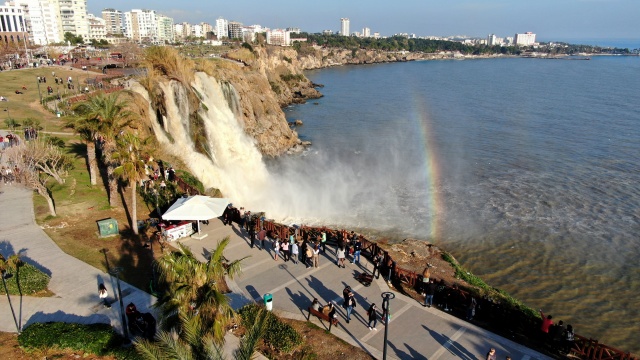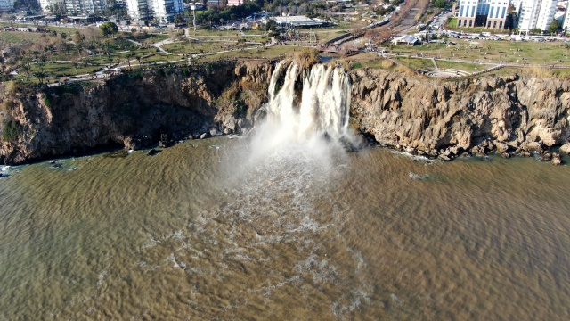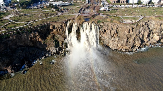 Antalya'nın dünyaca ünlü Düden Şelalesi'nin rengi, önceki günlerde kenti etkisi altına alan sağanak yağışın ardından kahverengiye döndü. Çamur çağlayan şelale, hafta sonu olması nedeniyle yerli ve yabancı turistlerin uğrak noktası oldu.
