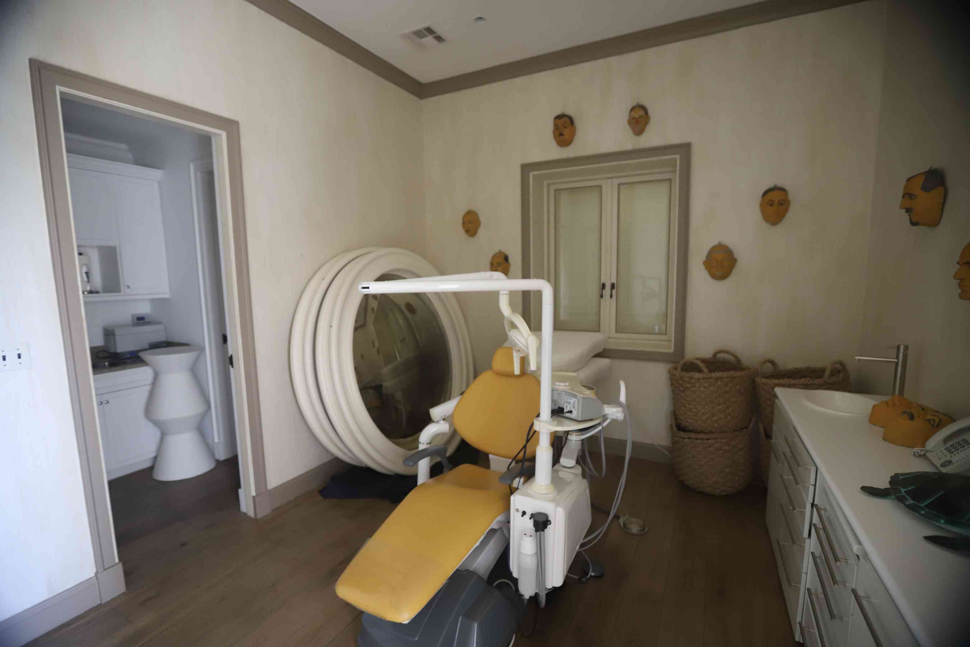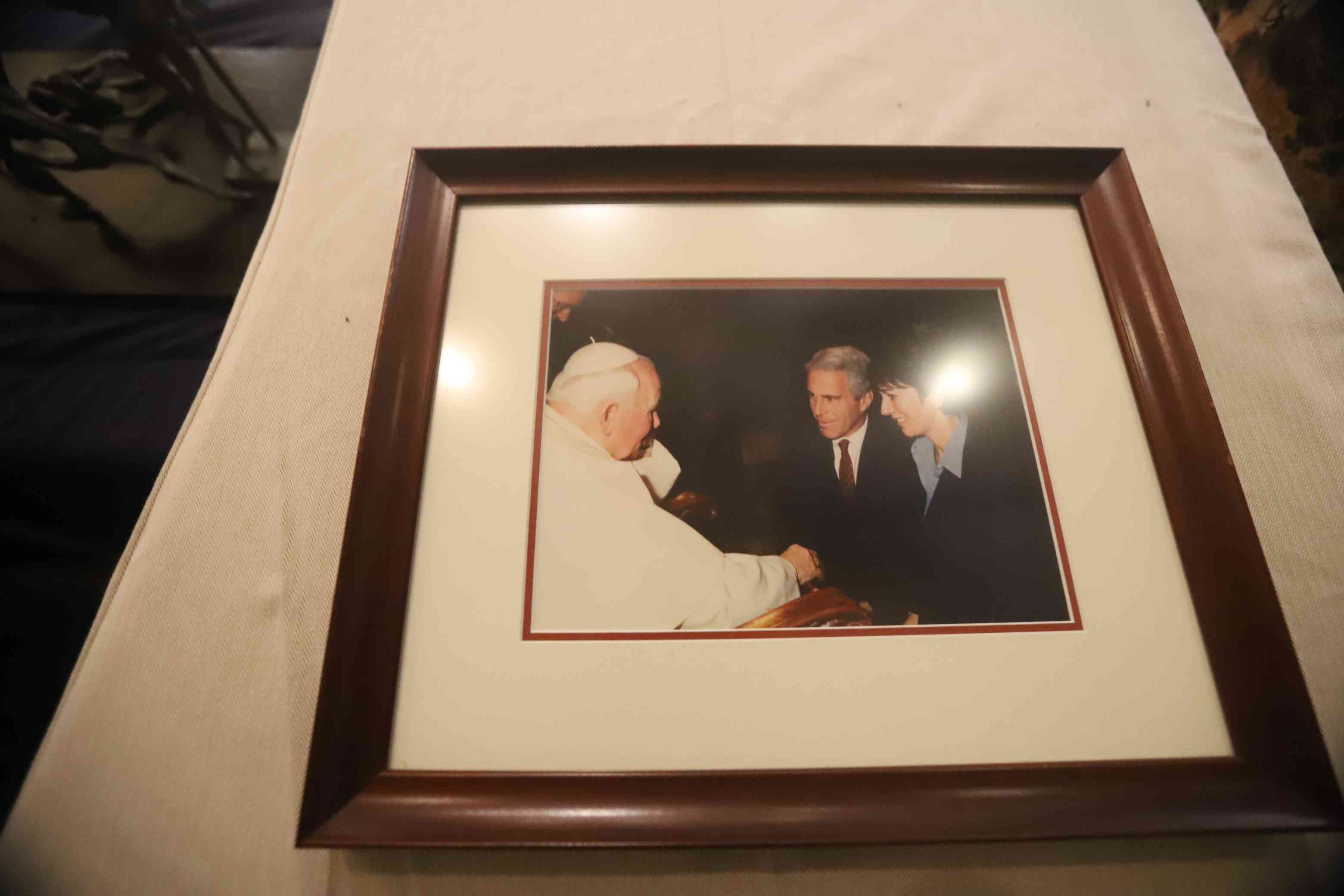 Fotoğraflarda, yatak odaları, duvarlarda maskelerin bulunduğu gizemli bir oda, hızlı arama tuşlarında isimlerin kayıtlı olduğu bir telefon, bir dişçi koltuğu ve Epstein ile suç ortağı eski sevgilisi Ghislaine Maxwell’in Papa II. Jean Paul ile çekilmiş bir fotoğrafı yer alıyor.