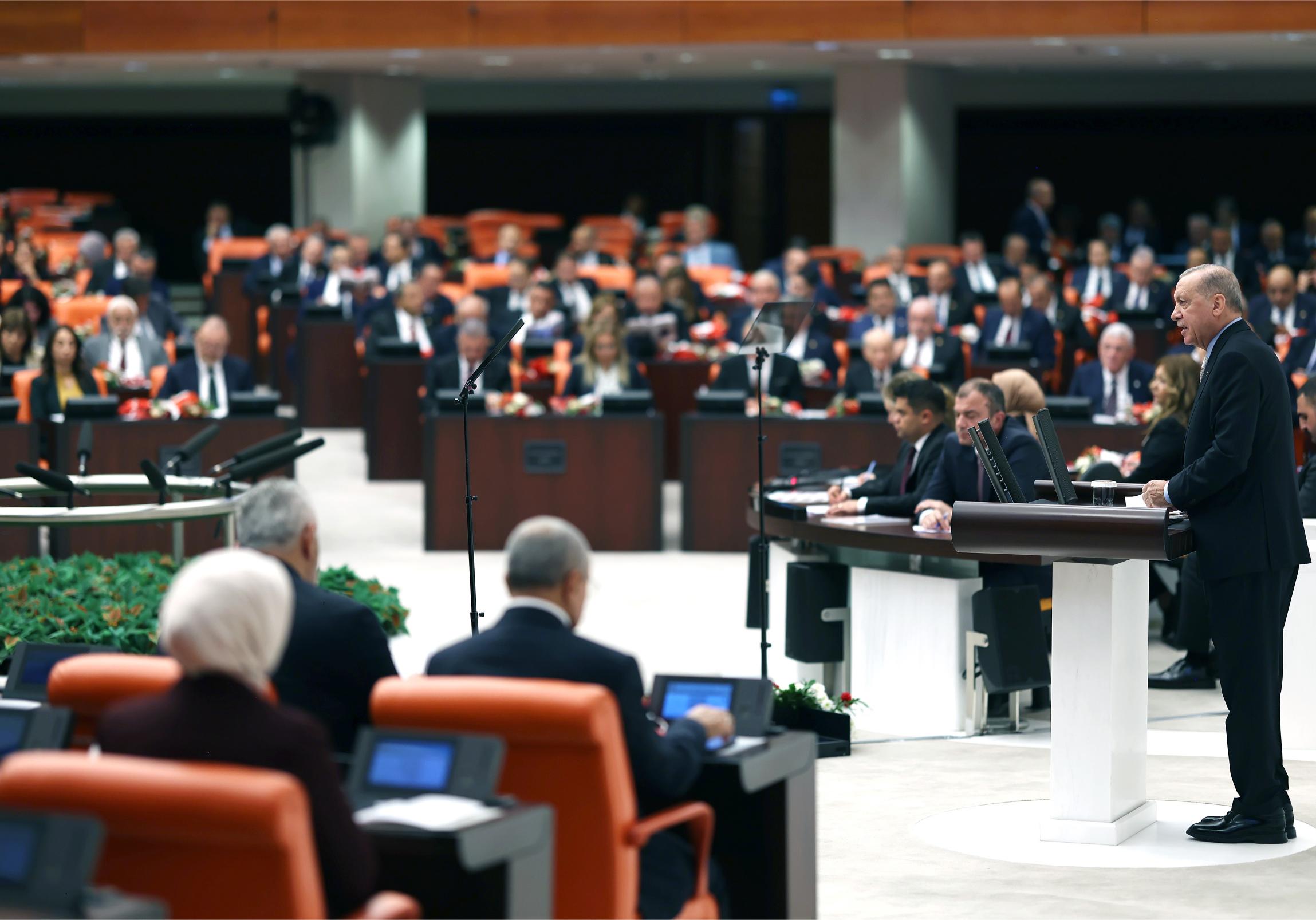 Geride bırakılan 1 yıl içinde 'terörsüz Türkiye' hedefine yönelik tarihi nitelikte adımlar atıldığını, önemli mesafeler alındığını bildiren Cumhurbaşkanı Erdoğan, "Bu vesileyle engin siyasi tecrübesi, birikimi ve dirayetiyle terörsüz Türkiye idealimizin mimarlarından olan Sayın Devlet Bahçeli'ye bir kez de huzurlarınızda ülkem ve milletim adına teşekkürlerimi ifade ediyorum. Aynı şekilde bu 1 yıllık süreçte yapıcı duruş ve çabalarıyla Türkiye'nin terörden arındırılması yolunda önemli katkılar vermiş olan DEM Parti heyetine ve yönetimine de şükranlarımı sunuyorum. Son nefesine kadar terör duvarının yıkılması, milletimizin her karışında barış ve kardeşliğin egemen olması için ter döken İstanbul Milletvekili Sayın Sırrı Süreyya Önder'i de burada rahmetle anıyorum. Geride bıraktığımız 1 yıl içinde terör örgütü saldırılarını durdurmuş, kendisini feshettiğini açıklamış, sembolik bir törenle silahlarını yakmıştır. 1984'ten bu yana hem on binlerce can kaybına hem de 2 trilyon dolarlık ekonomik kayba yol açan terör belası böylece bitme noktasına gelmiştir. Sürecin son derece hassas olduğunun farkındayız ancak en başından itibaren olumlu bakıyoruz, olumlu bakmak için çaba sarf ediyoruz" diye konuştu.