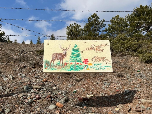 Eskişehir’de vatandaşların uğrak yerlerinden birisi olan kent ormanının çevresine atılan ve bırakılan çöpler, her geçen gün çoğalıyor. Çevre kirliliğinin oluştuğu bölgede hem doğa zarar görüyor hem de kötü görüntüler oluşuyor. Çöplerin bir bölümü çevreye gelişigüzel saçılırken, konteynıra atılan veya çevresine konulan atıkların da alınmak için beklediği görüldü. Tüm bu atıkların yanı başında bir vatandaşın astığı yazı dikkatleri çekiyor. Köpük üzerine ‘Bir milletin eğitimi ormanından belli olur’ yazan ve ormanla birlikte yaban hayvanı çizen vatandaş, bunları kent ormanını çevreleyen tellere astı. Çizimlerin altına ‘Yeşili ve ormanı seven’ yazarak rumuz bırakan vatandaş, görenlerin takdirini topladı.