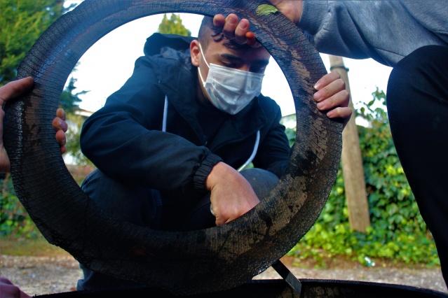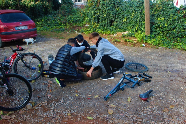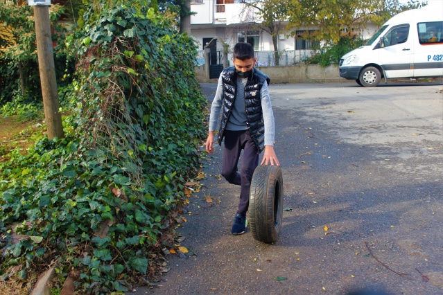 Araba lastikli bisiklet yapımına arkadaşıyla birlikte pandemi döneminde can sıkıntısıyla başladıklarını belirten Mücahit Gırgıç, “Bizim arabamızdan çıkan boşta kalan bir lastiğimiz vardı. Arkadaşımla ‘bu lastiği ne yapabiliriz?’ diye düşünüp taşındık.