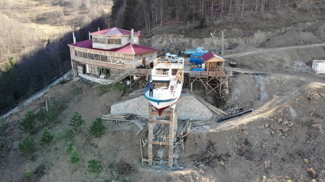 - Düzköy ilçesinde beton yapının üzerine yerleştirilen 15 metrelik tekne görenleri şaşırtıyor