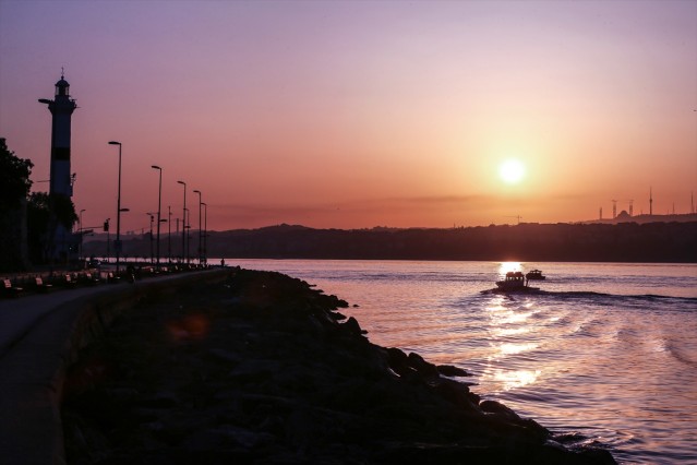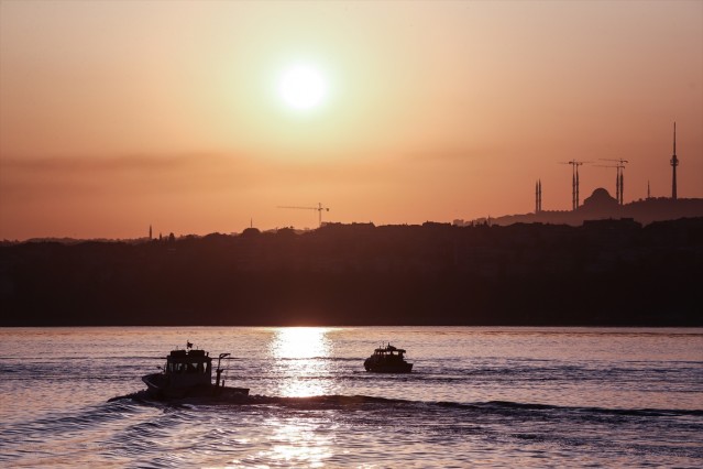 İstanbul'da gün doğumu sırasında Çamlıca Camisi ve tekneler silüet oluşturdu.