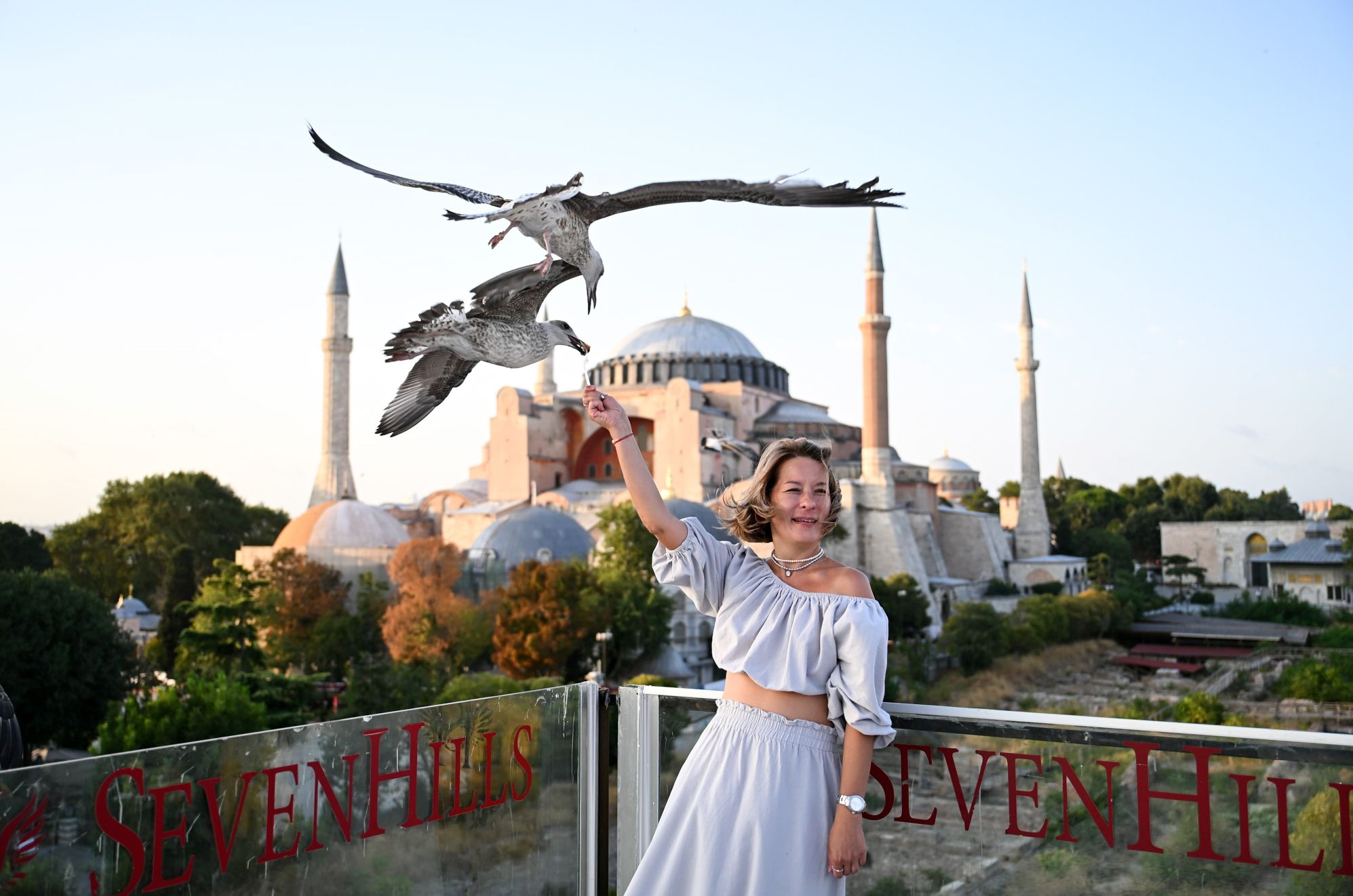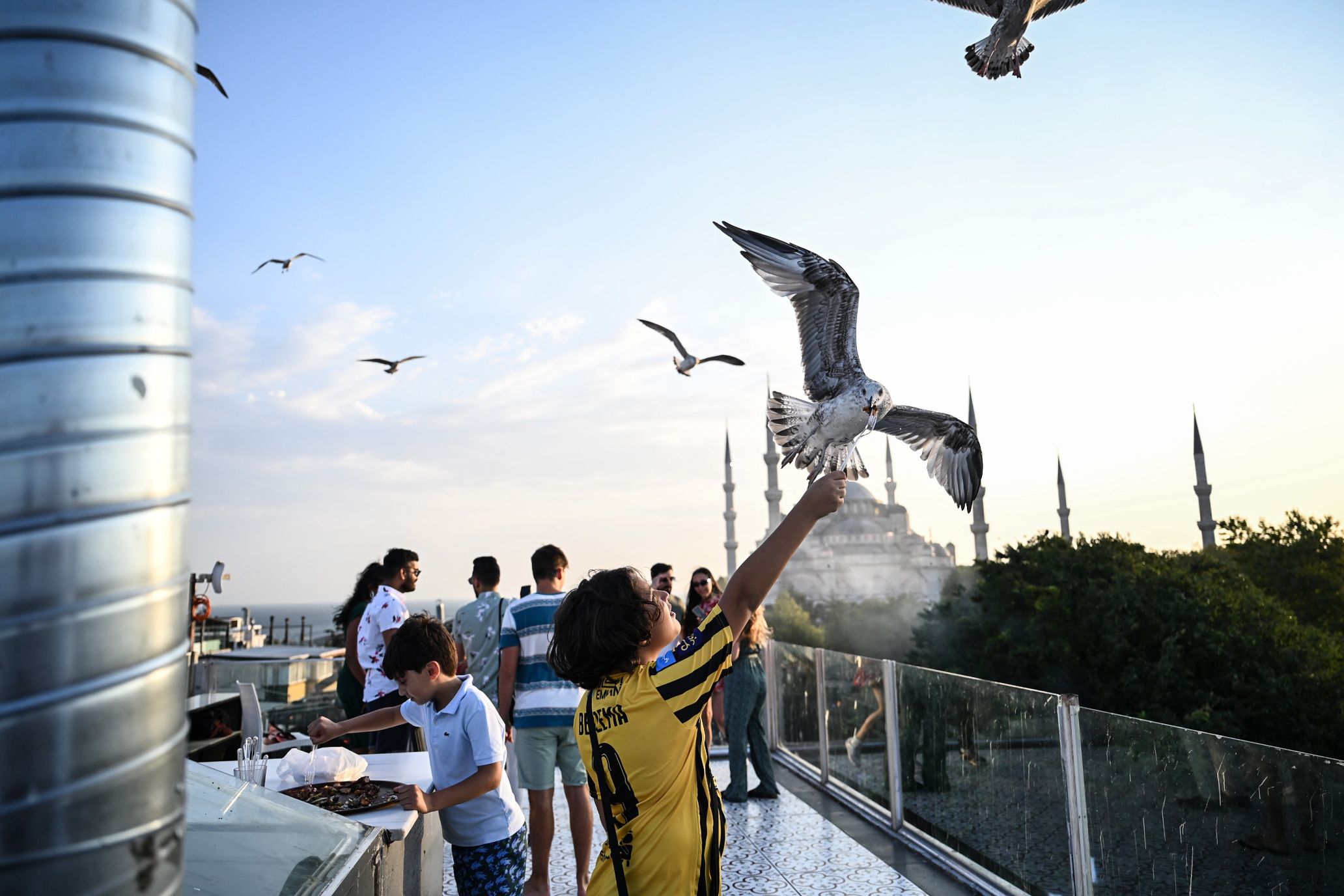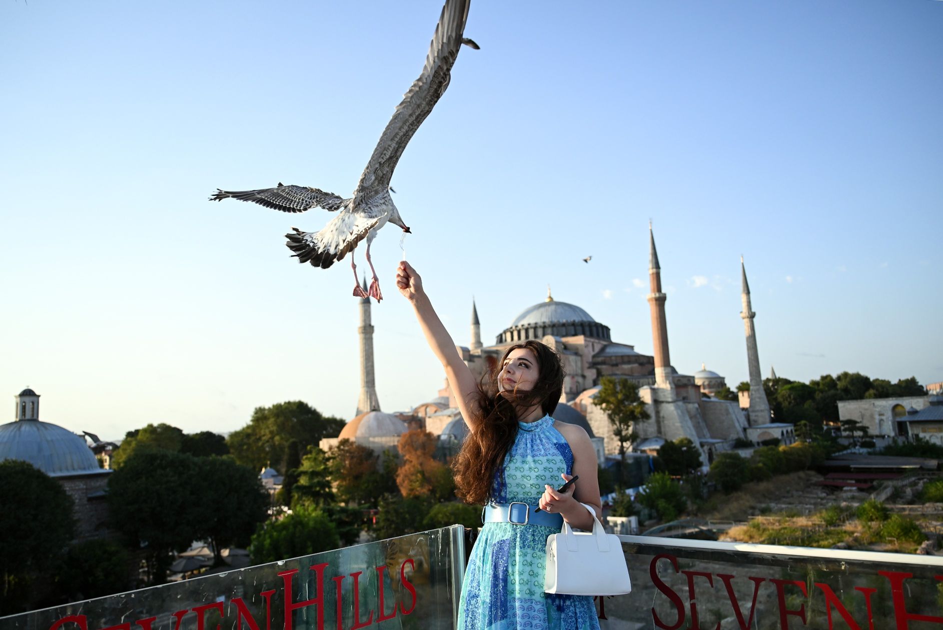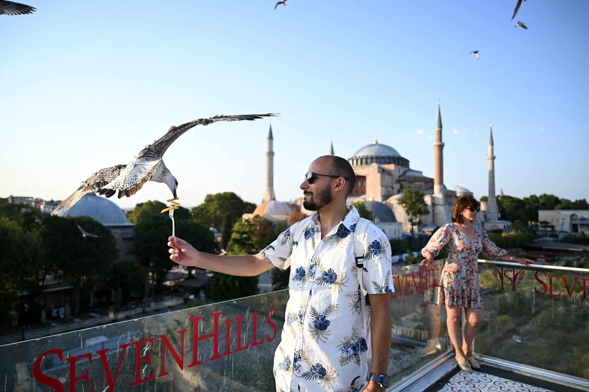 İstanbul'un simgelerinden Ayasofya Camii ve Sultanahmet Camii'nin manzarası eşliğinde artık yemeklerden martıları besleyen turistler, fotoğraf çekmek için binlerce kilometre yol katediyor. Dünyanın birçok ülkesinden binlerce kilometre yol katederek İstanbul'a gelen yabancı turistler, Ayasofya Camii ve Sultanahmet Camii manzarasında martıları besliyor. Turistler martıları besleyerek fotoğraf çekinmek için tatil rotalarını İstanbul'a çevirdi. Turistlerin uğrak tarihi mekanlarından olan Ayasofya ve Sultanahmet Camii'nde İstanbul manzarasında yer alan bir işletme günde yaklaşık 2 bin turisti ağırlıyor. Buraya gelen turistler yemek artıklarını restoranın terasında martılara veriyor. Turistlerin martıları besleyerek fotoğraf çektirmek için binlerce kilometre yol katettiği dikkat çekerken, restorana bir şey yiyip içmeden de misafirler ücretsiz bir şekilde gelebiliyor.