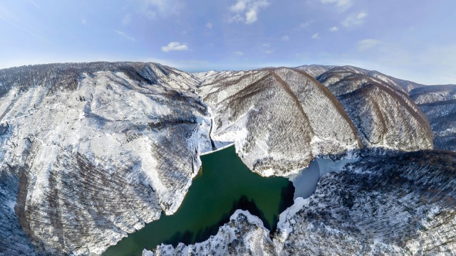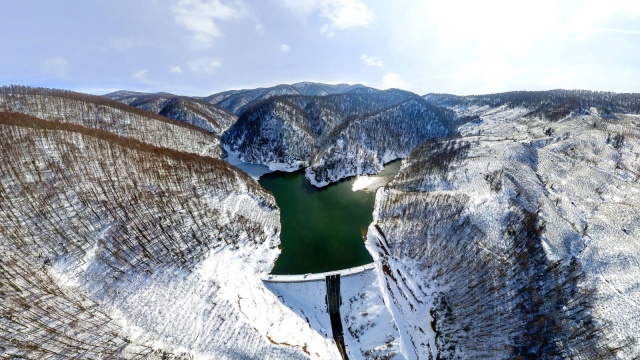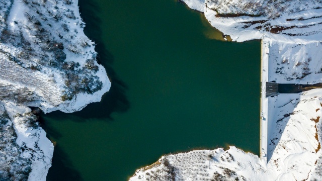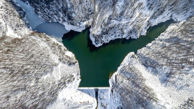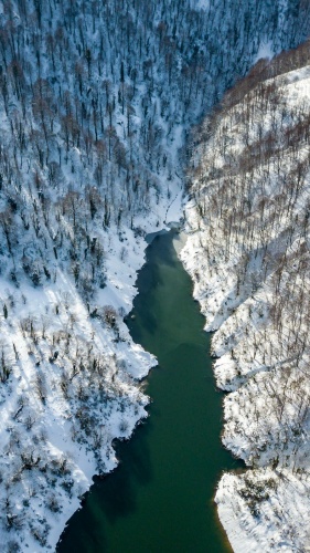 Düzce'de Kaplandede dağlarının eteklerindeki bulunan ve beyaz örtü ile kaplanan Sarıyayla Baraj Göleti, kartpostallık görüntüler oluşturdu. Görsel şölen sunan gölet havadan görüntülendi.