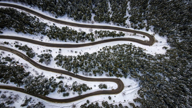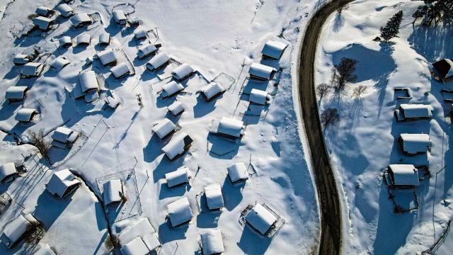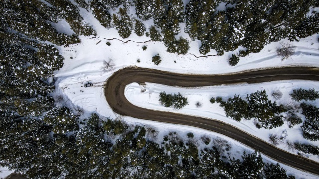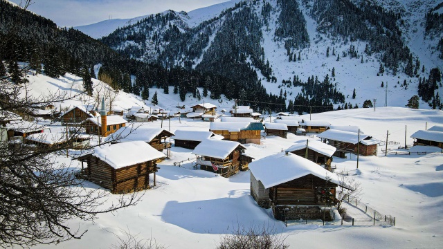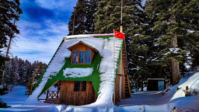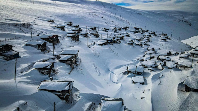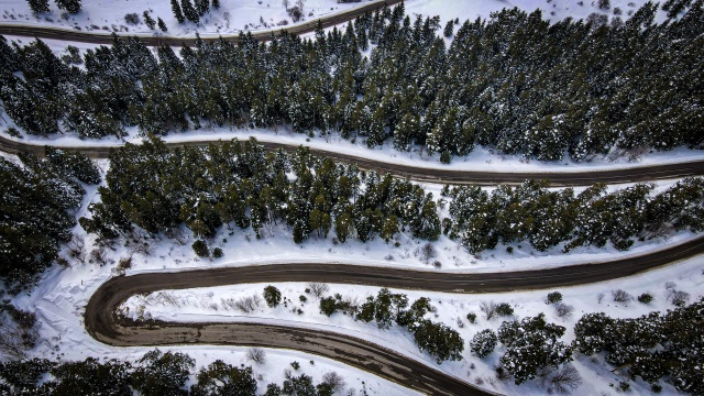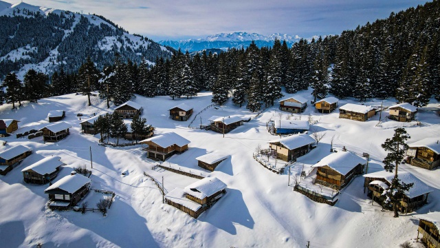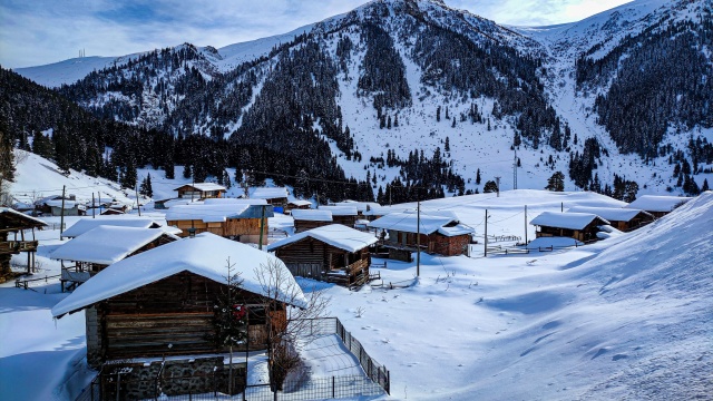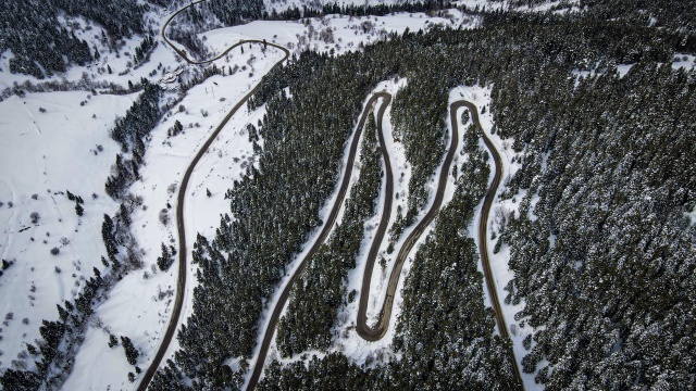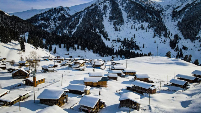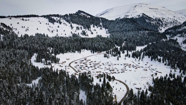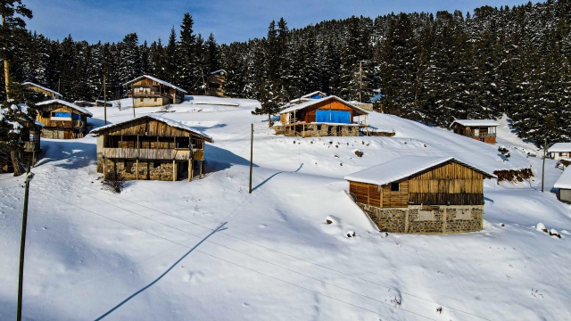 Doğal ve yaşlı ormanlar içinde yer alan ladin, sarıçam ve köknar ağaçlarının etrafına kurulan yayla evlerinin çatıları karla kaplanırken, karayolunda seyahat edenler durup, yol kenarından bol bol fotoğraf çekiyor.