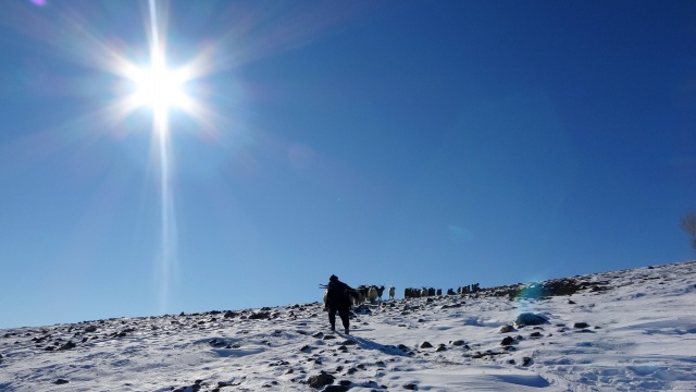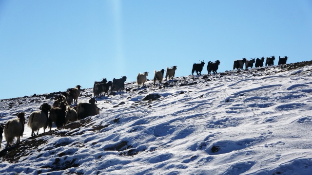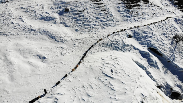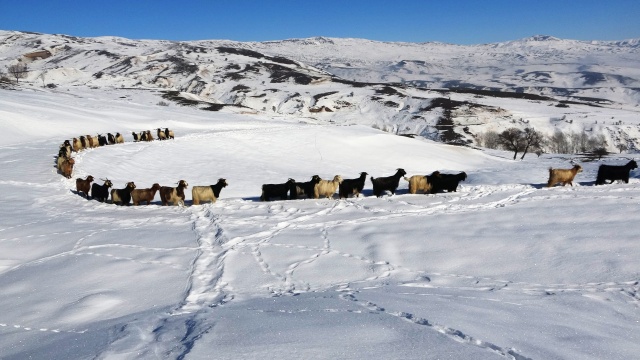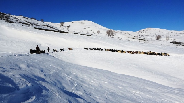Günün ilk ışıklarıyla yola çıkan besiciler, hayvanlarını karla kaplı dağların arasındaki patika yoldan dondurucu soğuğa rağmen 4 saatlik yürüyüşle köye ulaştırabildi. Hayvanların kar üzerinde yayladan köye yolculuğunun drone ile havadan görüntülenmesi güzel görüntüler oluşturdu.