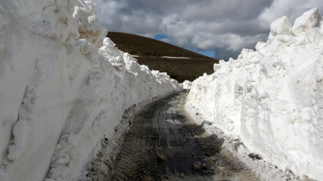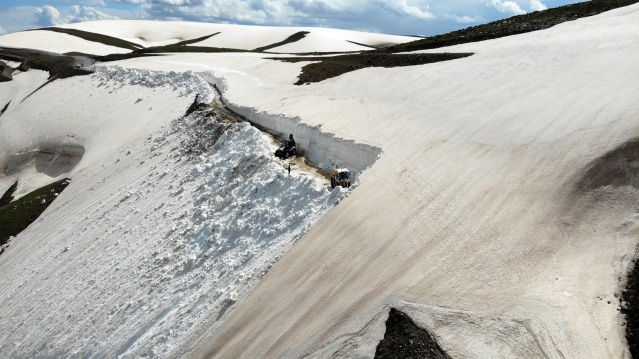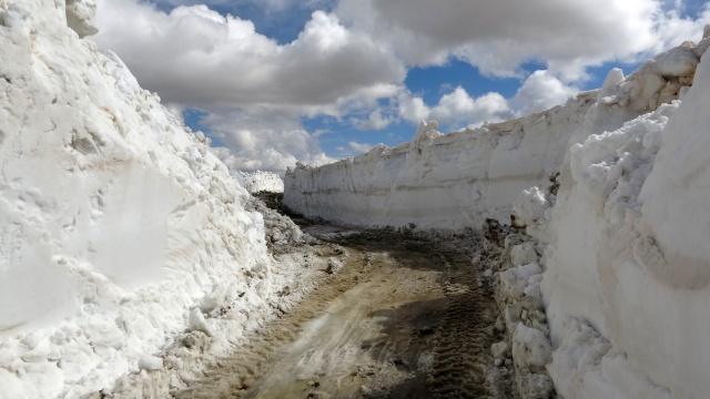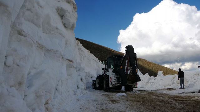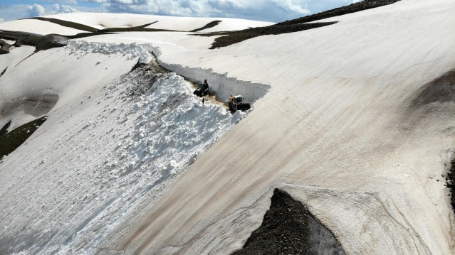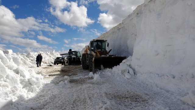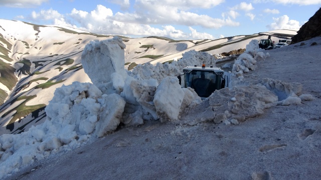 Yoğun kar yağışı ve fırtına nedeniyle yılın 6 ayı ulaşıma kapalı olan 2 bin 500 rakımlı yolda 2 iş makinesi ve 4 personelle çalışma yürüten ekipler, çığ riskine karşı kar kalınlığının 5 metreye ulaştığı bölgeleri adım adım geçti.
