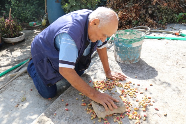 Evinin bahçesindeki 4 tane Antep fıstığı ağacından yaklaşık 50 kilogram fıstık aldığını aktaran Üzeyir Güven, tadının çok güzel olduğunu söyledi. Dış kabuğunu betonun üstünde taşla ezerek soyduklarını ifade eden Güven, “Geçen sene 4 ağaçtan 3 teneke Antep fıstığı çıktı. Bize tadı çok güzel geliyor. Kavurmadan yiyoruz. Evde geçen seneden bile kurumuş Antep fıstıkları var. Dış kabuğunu açmasını da öğrendik. Bize çok zor geliyordu ama çok basitmiş. Benim Antep fıstıkları az olduğu için soyma makinasına gerek yok. Kendimiz betonun üzerine döküp kaldırım taşını üzerinde gezdirip kabuklarını sıyırıp alıyoruz ve sonra da kurutuyoruz” dedi.